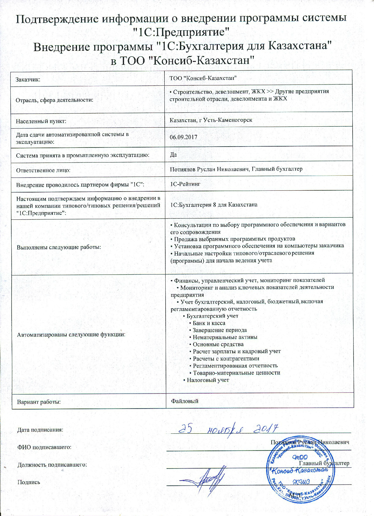 | Внедренное типовое решение: | 1С:Бухгалтерия 8 для Казахстана |