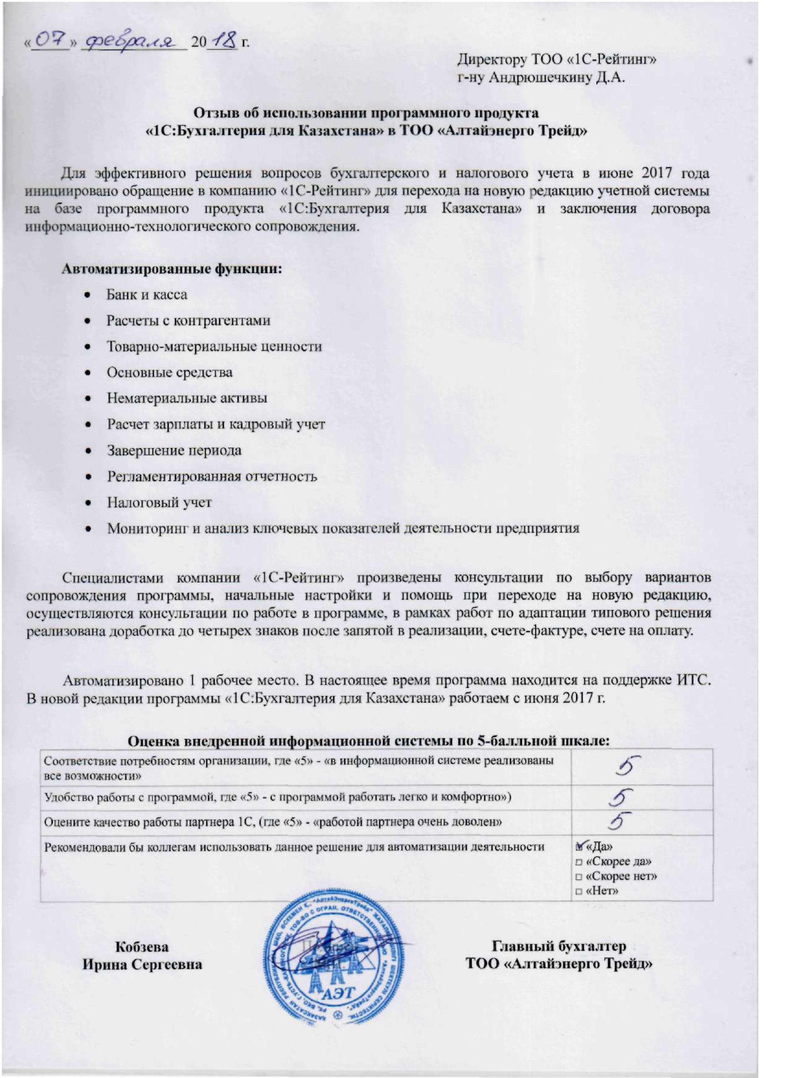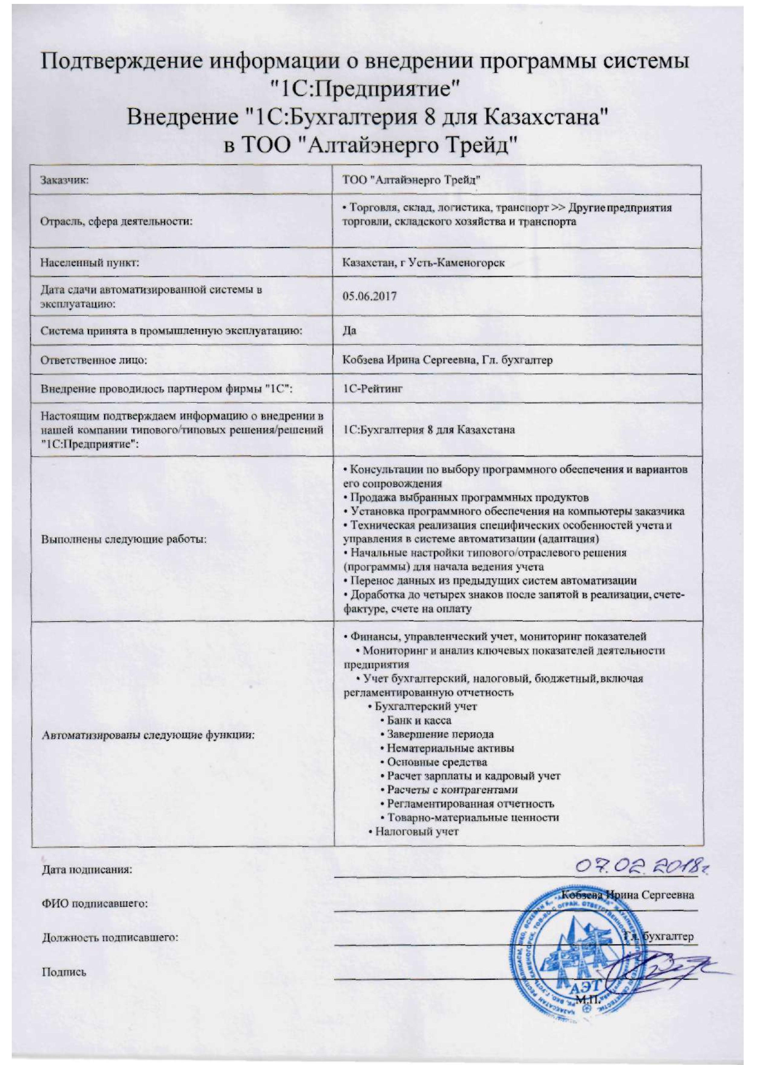 | Внедренное типовое решение: | 1С:Бухгалтерия 8 для Казахстана |