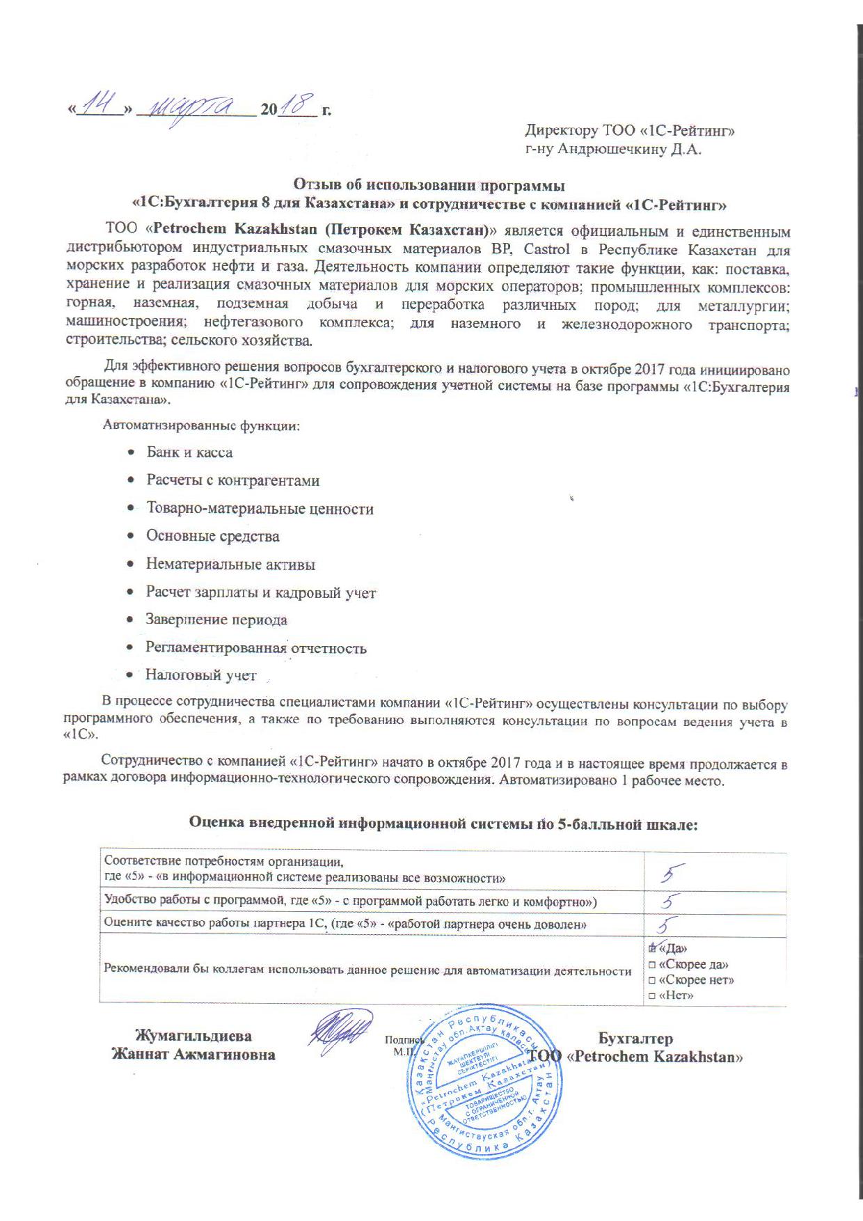 ТОО «Petrochem Kazakhstan» является официальным и единственным дистрибьютором индустриальных смазочных материалов BP, Castrol в Республике Казахстан для морских разработок нефти и газа. Деятельность компании определяют такие функции, как: поставка, хранение и реализация смазочных материалов для морских операторов; промышленных комплексов: горная, наземная, подземная добыча и переработка различных пород; для металлургии; машиностроения; нефтегазового комплекса; для наземного и железнодорожного транспорта; строительства; сельского хозяйства.