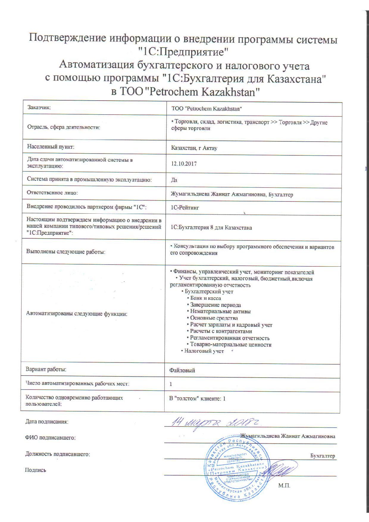 | Внедренное типовое решение: | 1С:Бухгалтерия для Казахстана |