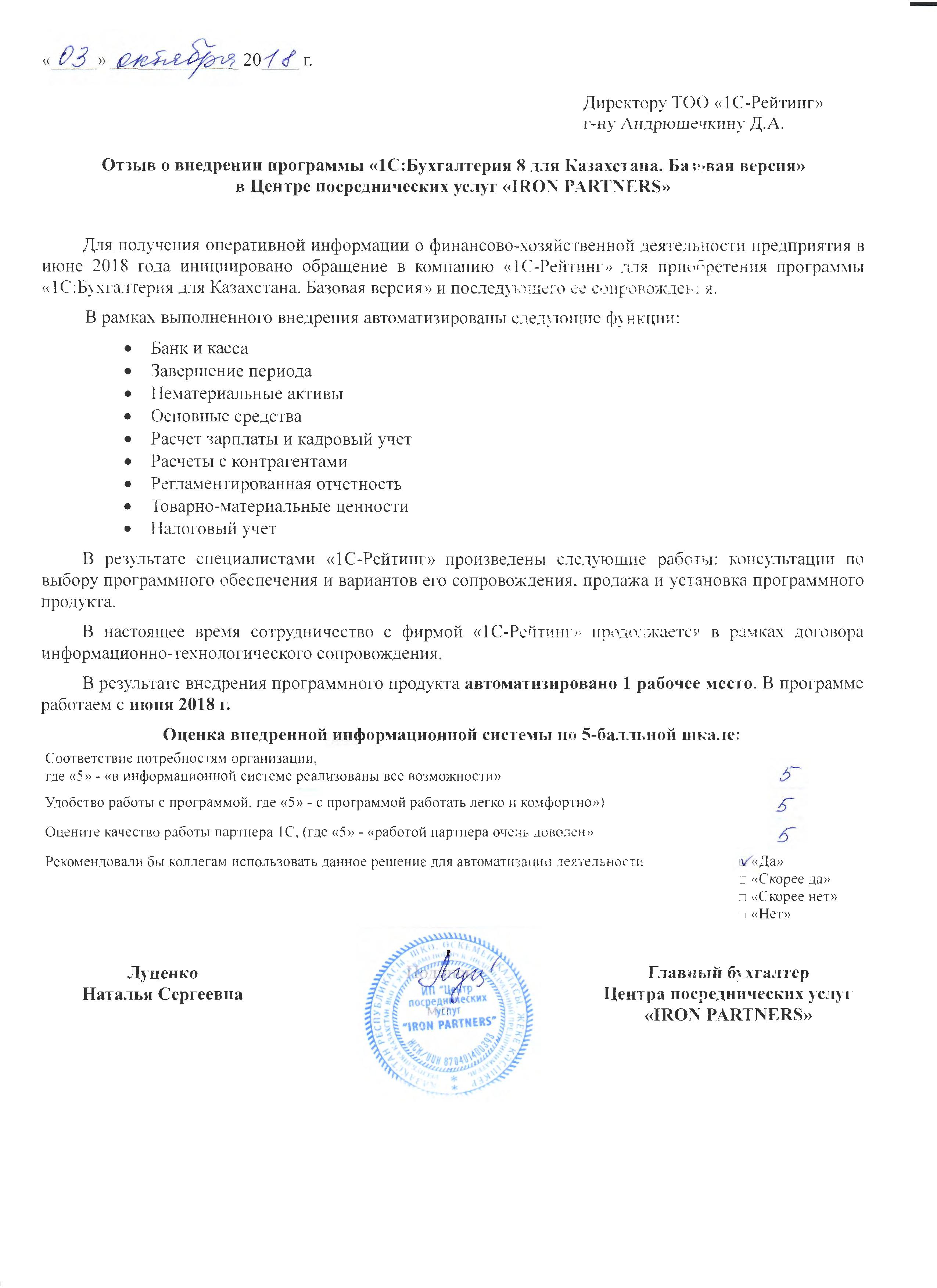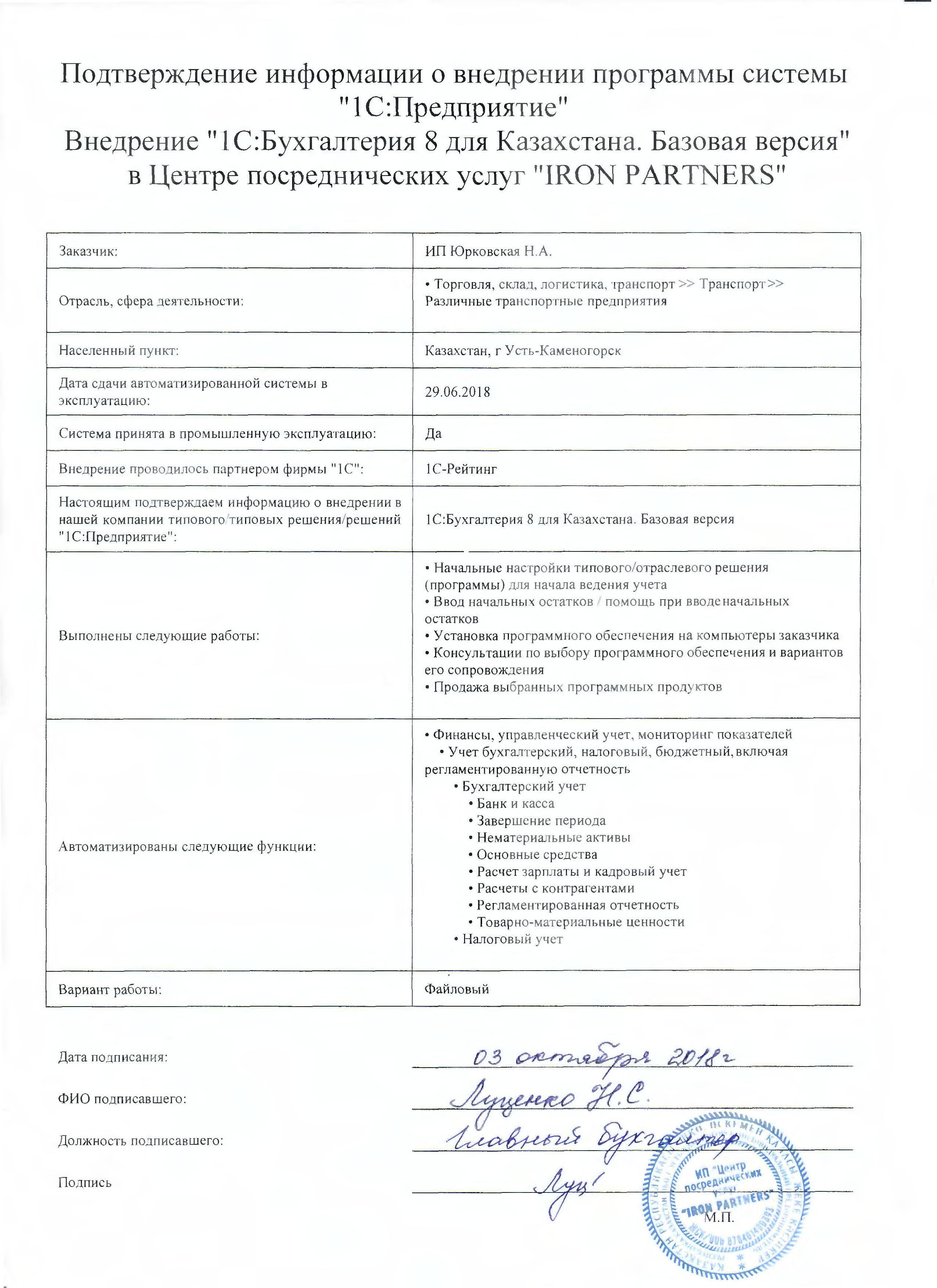 - Ежемесячно производятся работы по обновлению платформы и типовых конфигураций, диагностика состояния информационной базы, создание архивных копий