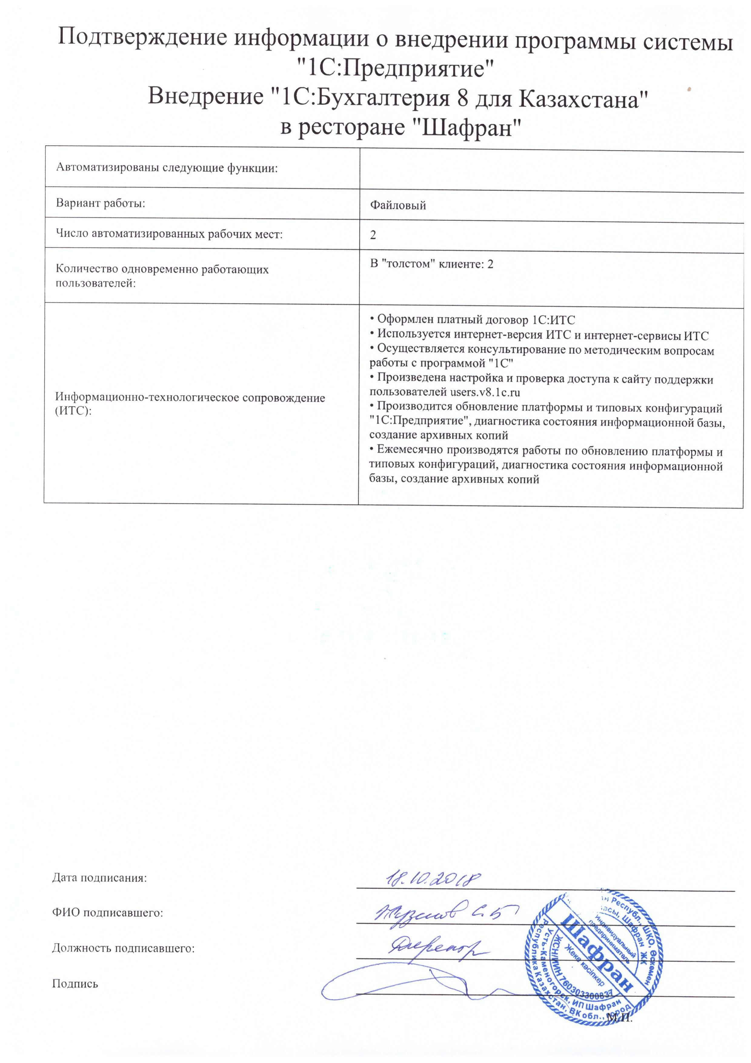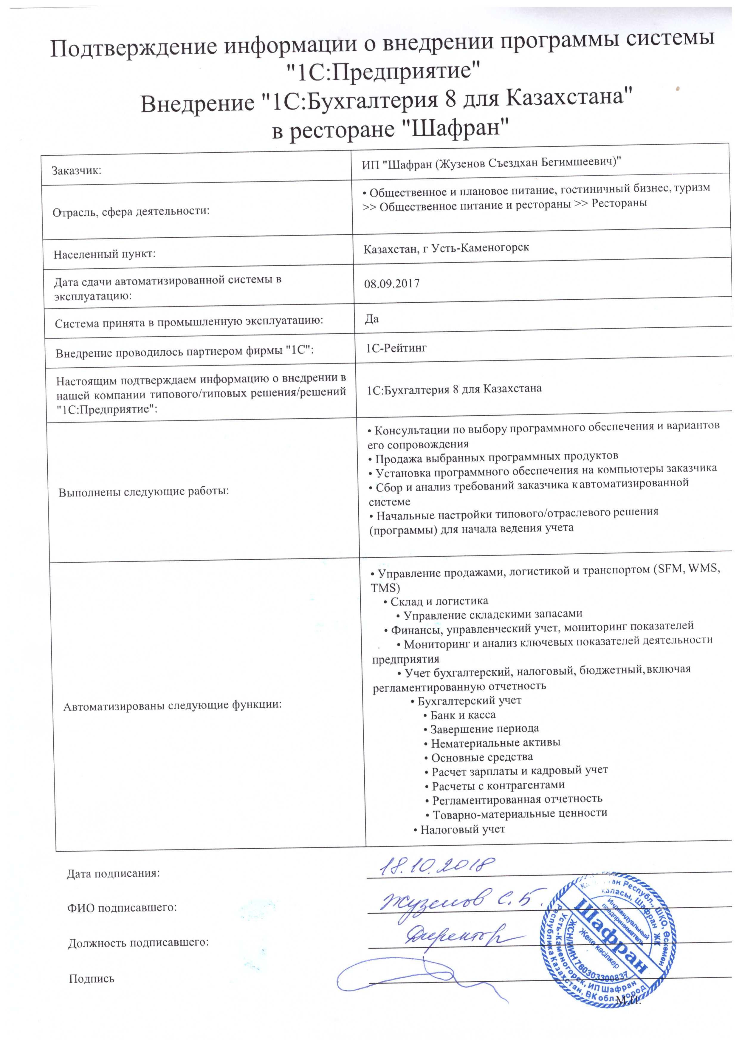 Внедрение «1C:Бухгалтерия 8 для Казахстана» в ресторане «Шафран»