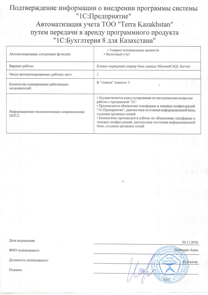 | Арендованное типовое решение: | 1С:Бухгалтерия для Казахстана |