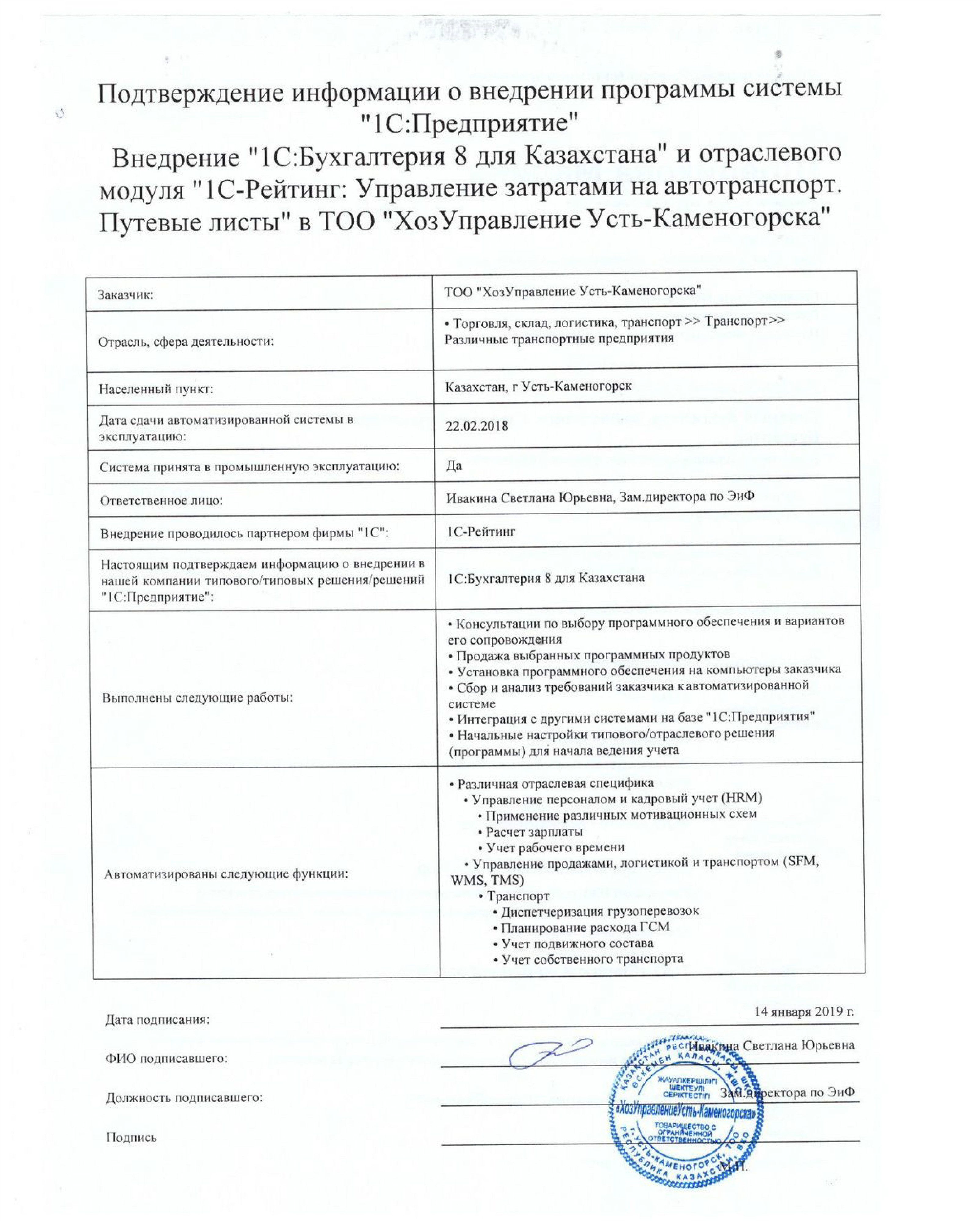 Внедрение «1С:Бухгалтерия 8 для Казахстана» и отраслевого модуля «1С-Рейтинг: Управление затратами на автотранспорт. Путевые листы» в ТОО «ХозУправление Усть-Каменогорска»