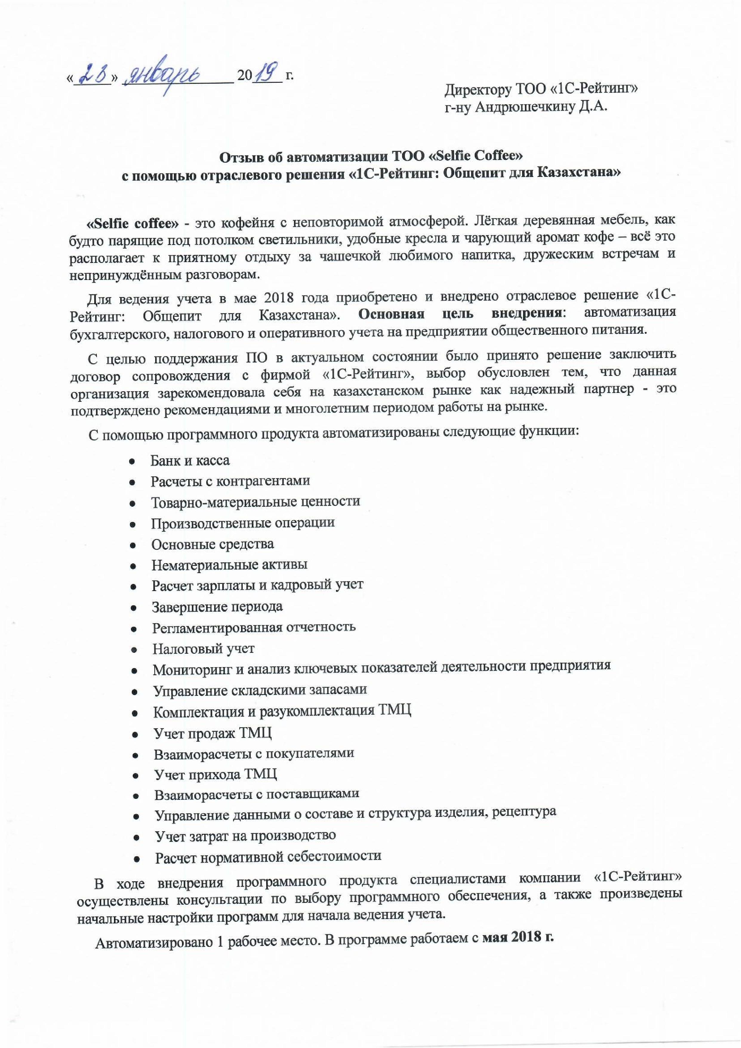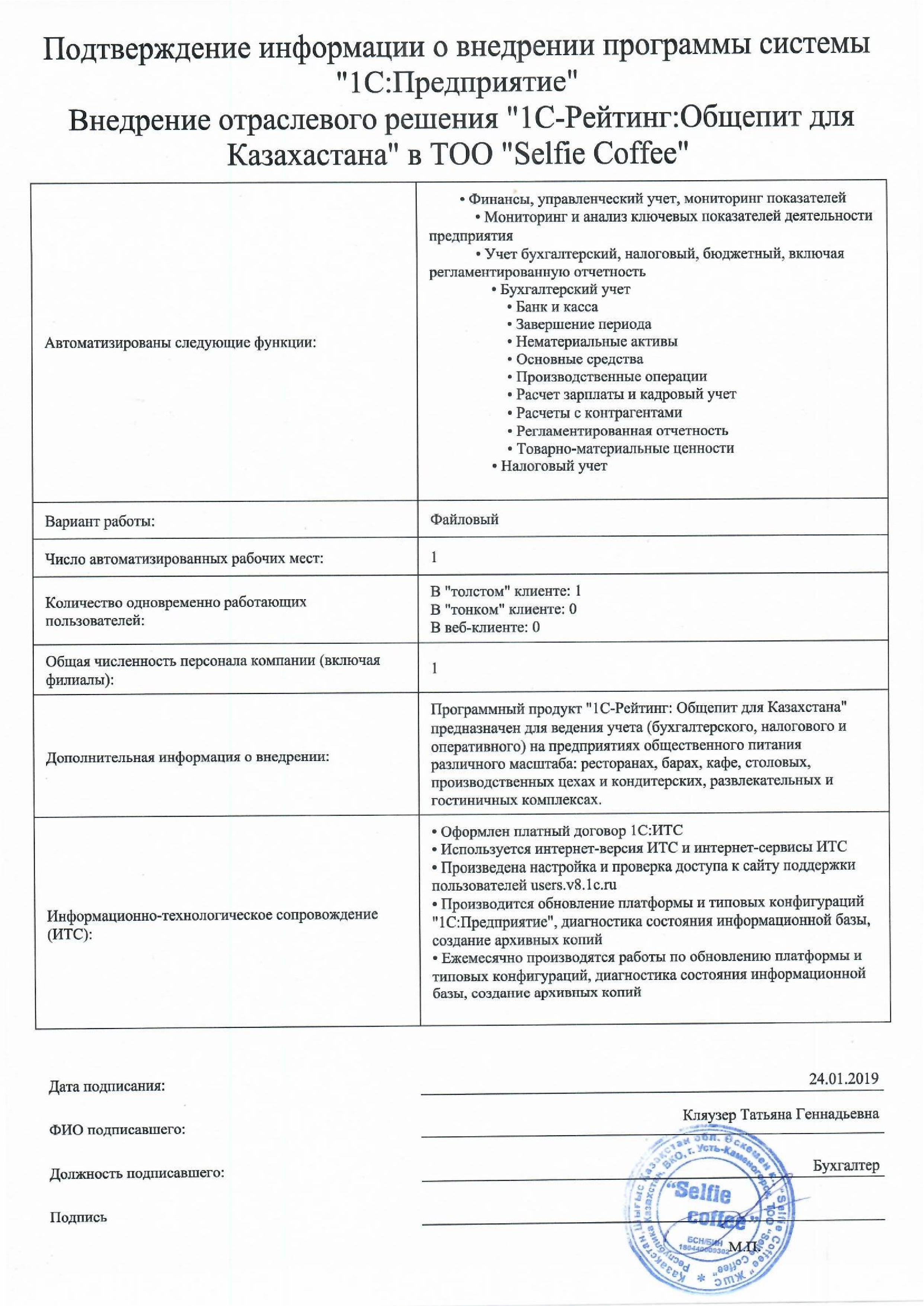 | Внедренное отраслевое решение: | 1С-Рейтинг: Общепит для Казахстана |