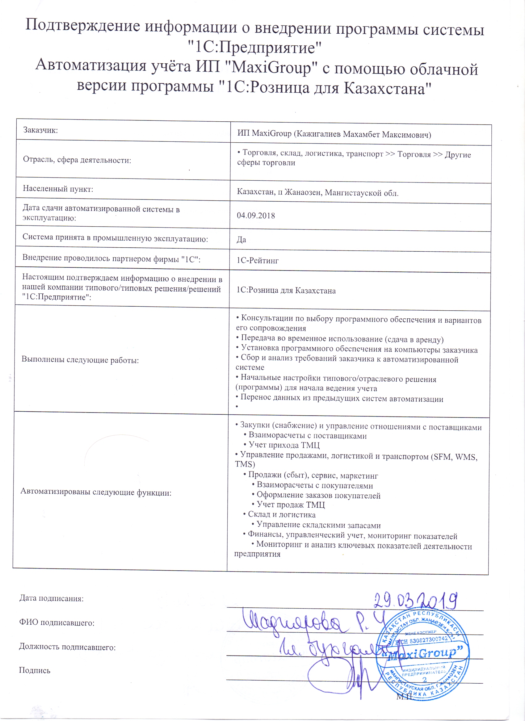 | Внедренное типовое решение: | 1С:Розница 8 для Казахстана |