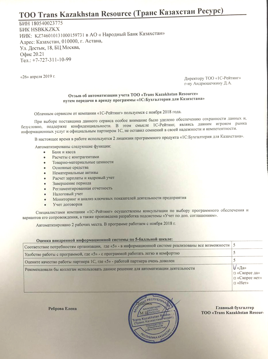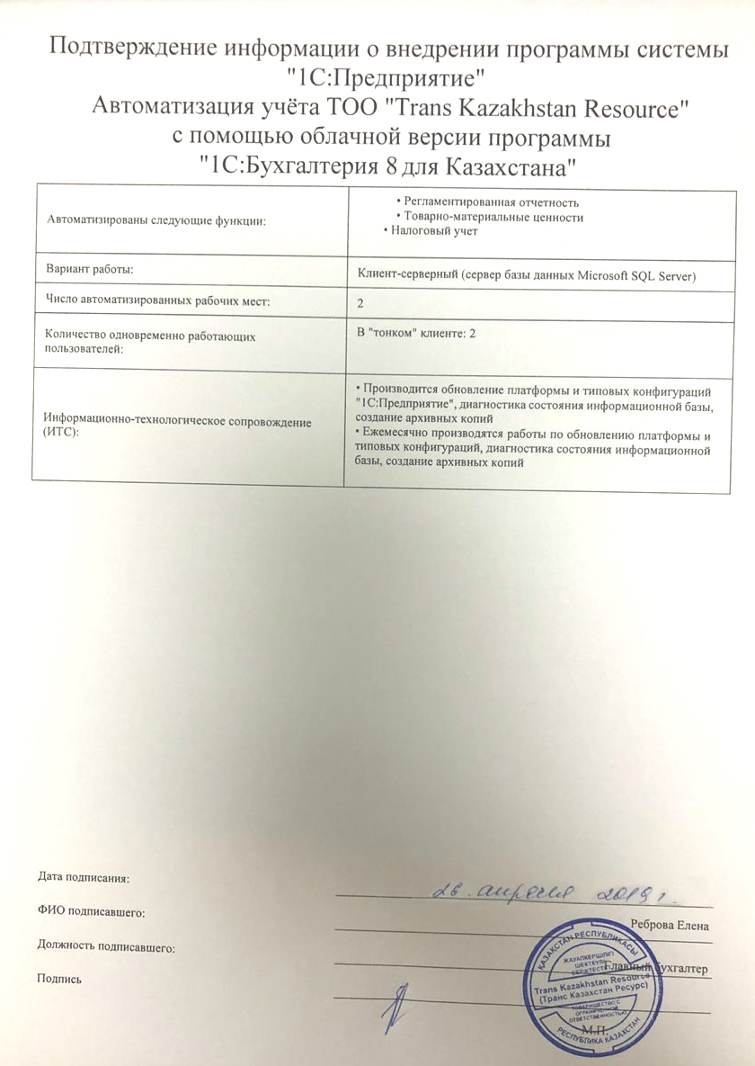 | Арендованное типовое решение: | 1С:Бухгалтерия для Казахстана |