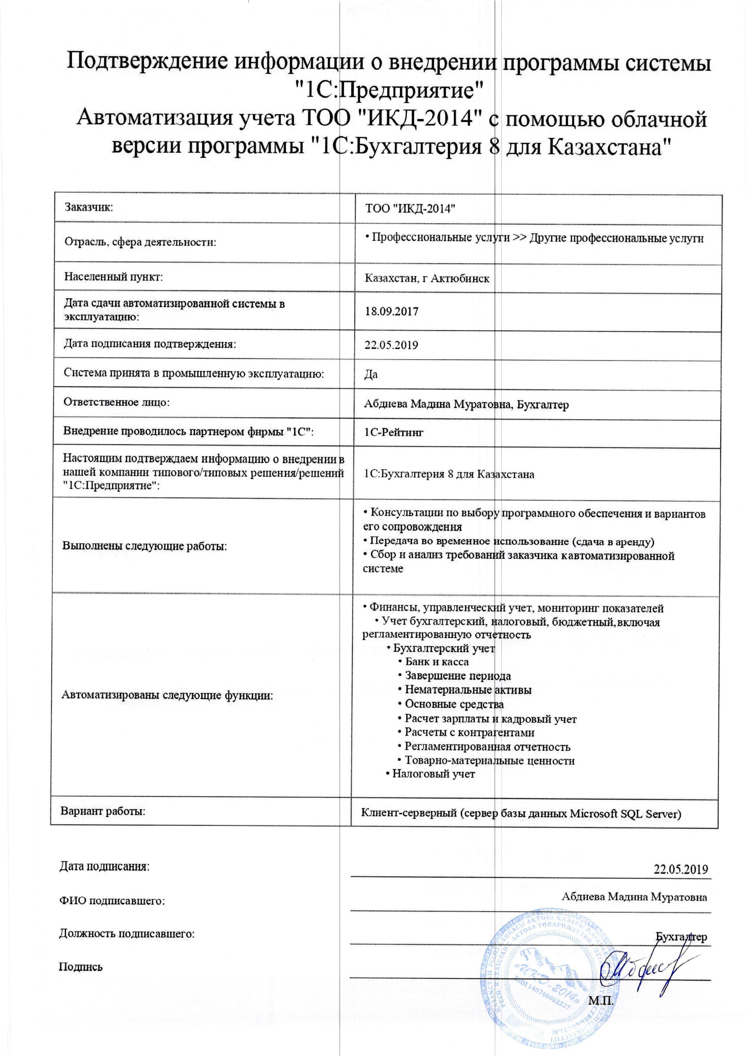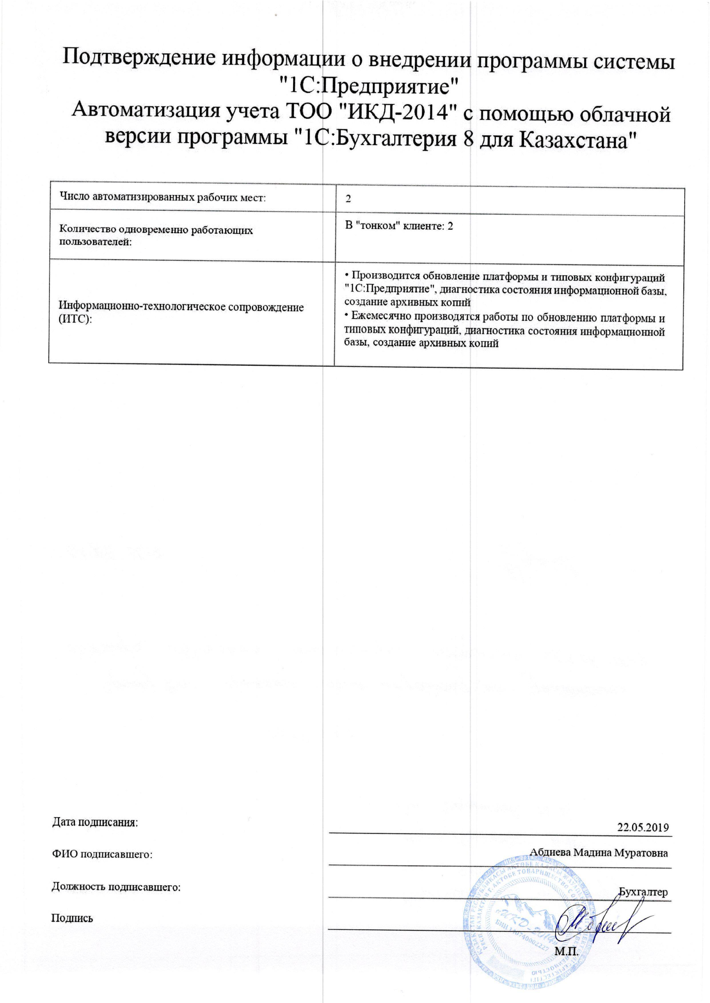 | Арендованное типовое решение: | 1С:Бухгалтерия для Казахстана |