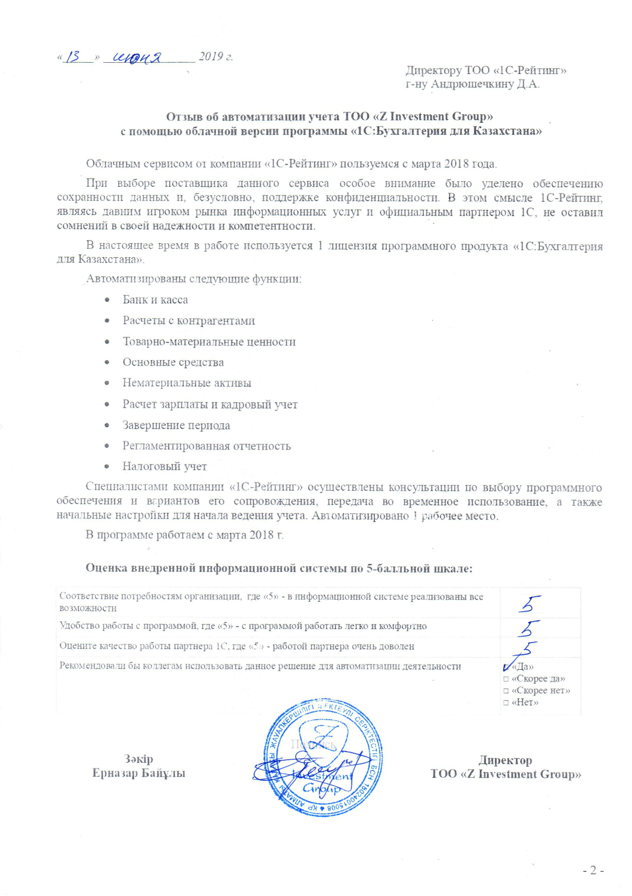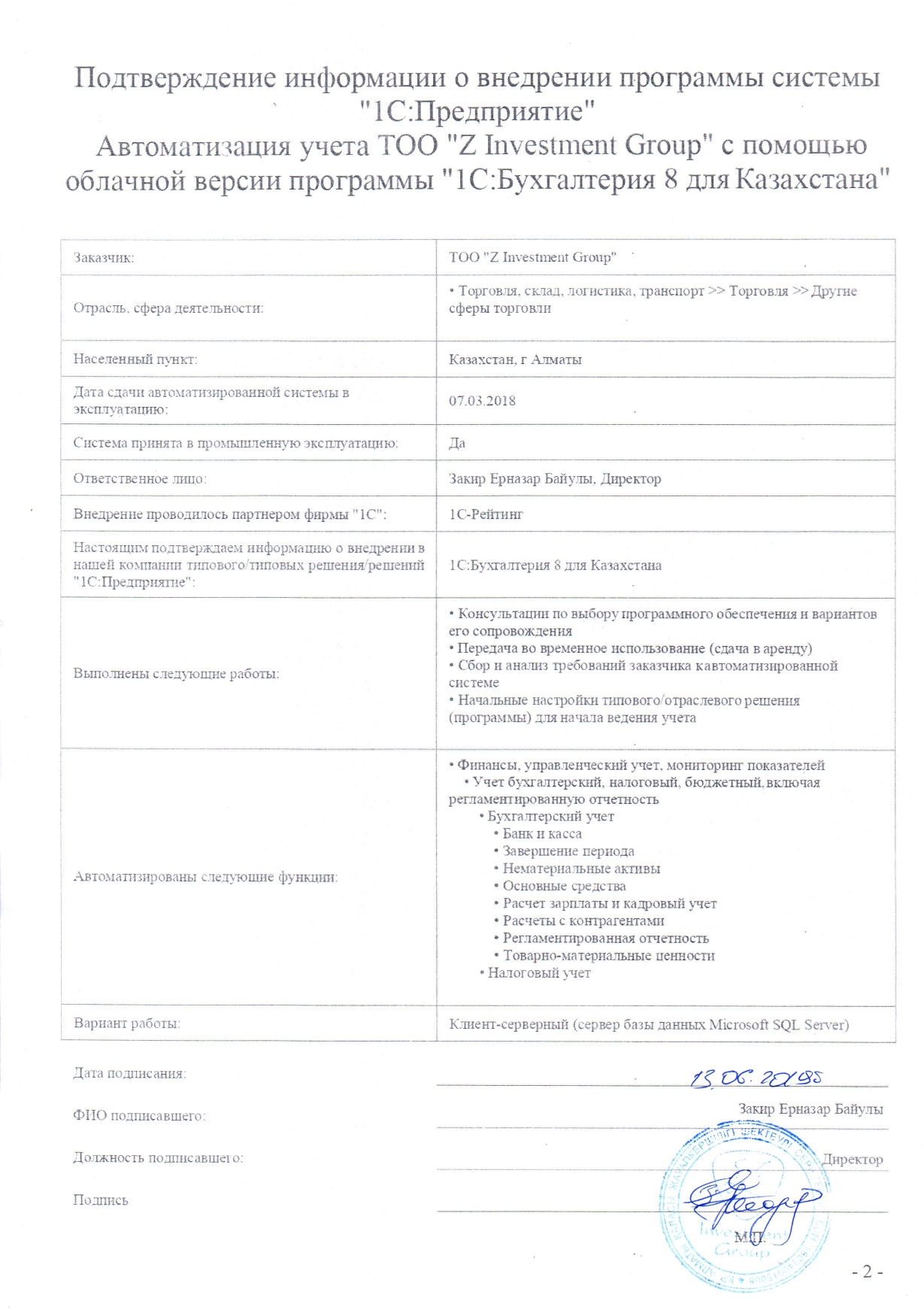 Автоматизация учёта ТОО «Z Investment Group» с помощью облачной версии программы «1С:Бухгалтерия для Казахстана»