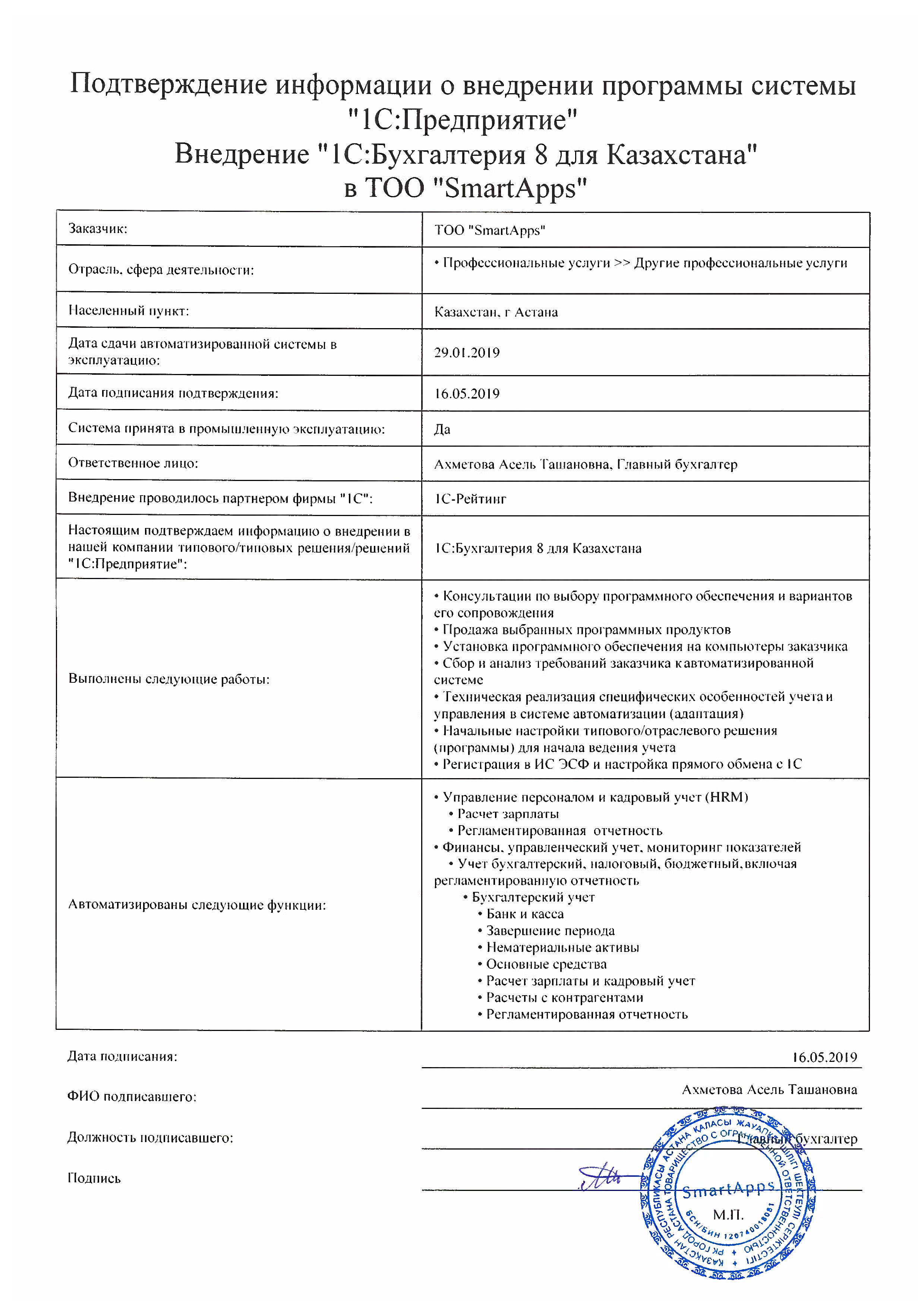 | Внедренное типовое решение: | 1С:Бухгалтерия 8 для Казахстана |