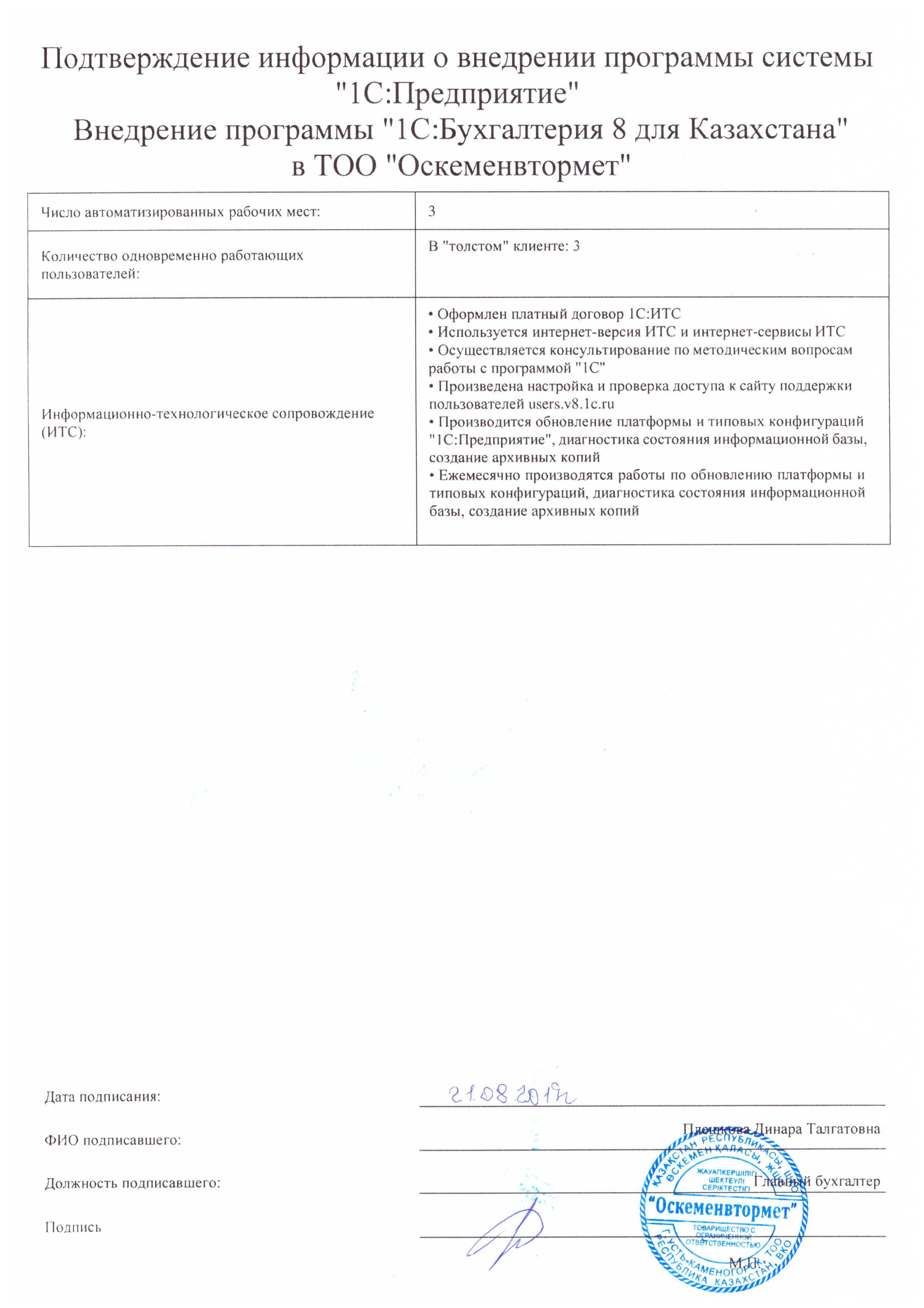 | Внедренное типовое решение: | 1С:Бухгалтерия 8 для Казахстана |