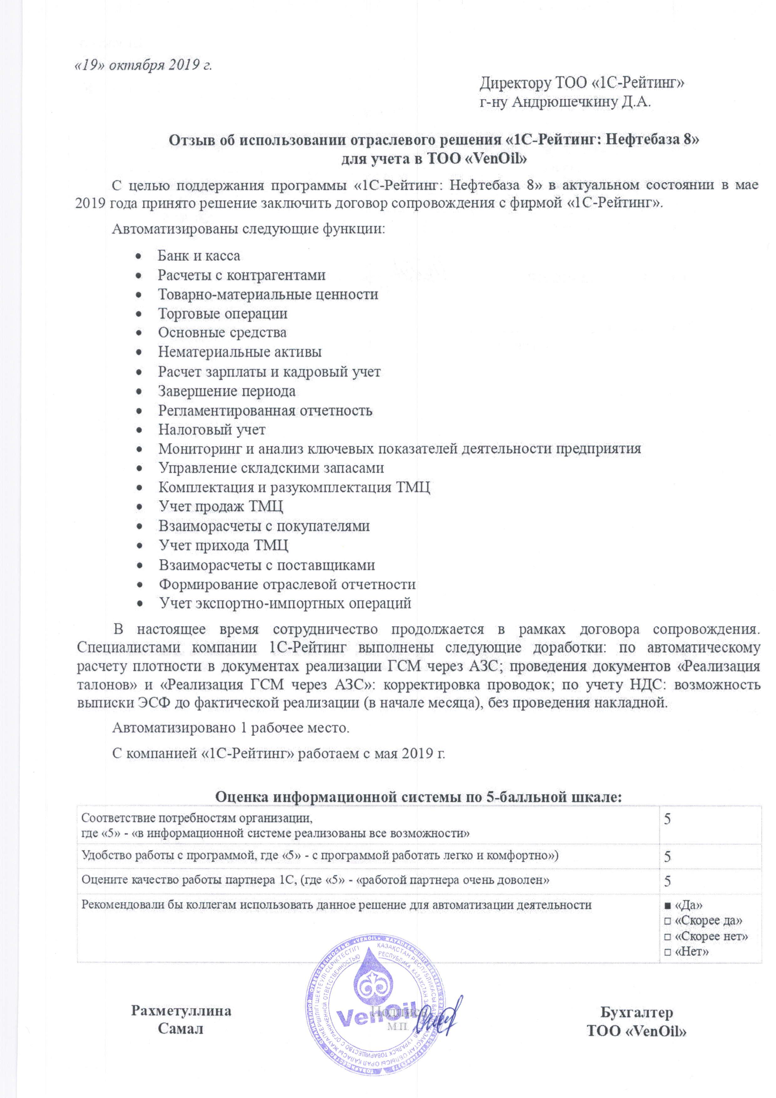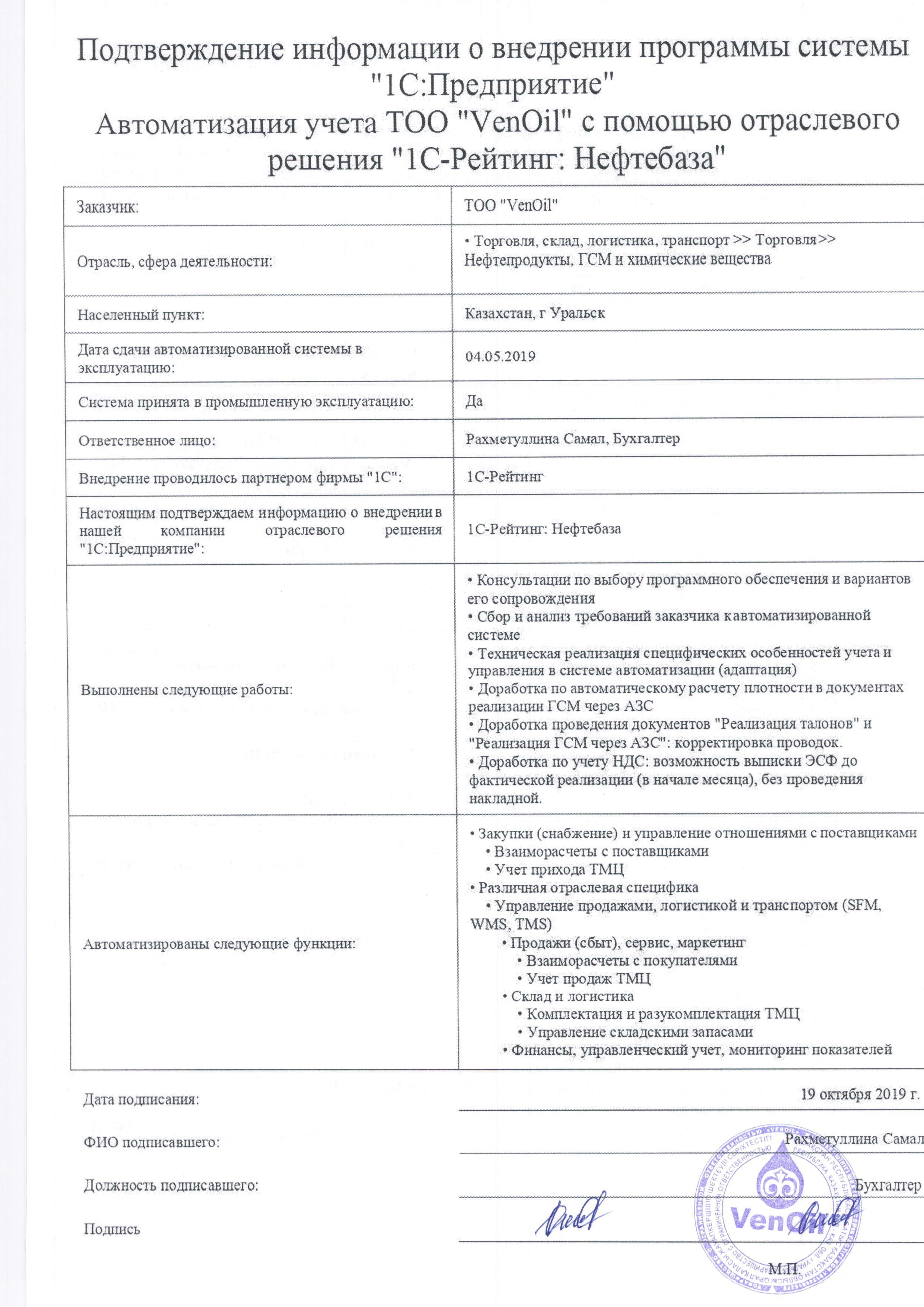 | Внедренное отраслевое решение: | 1С-Рейтинг: Нефтебаза |