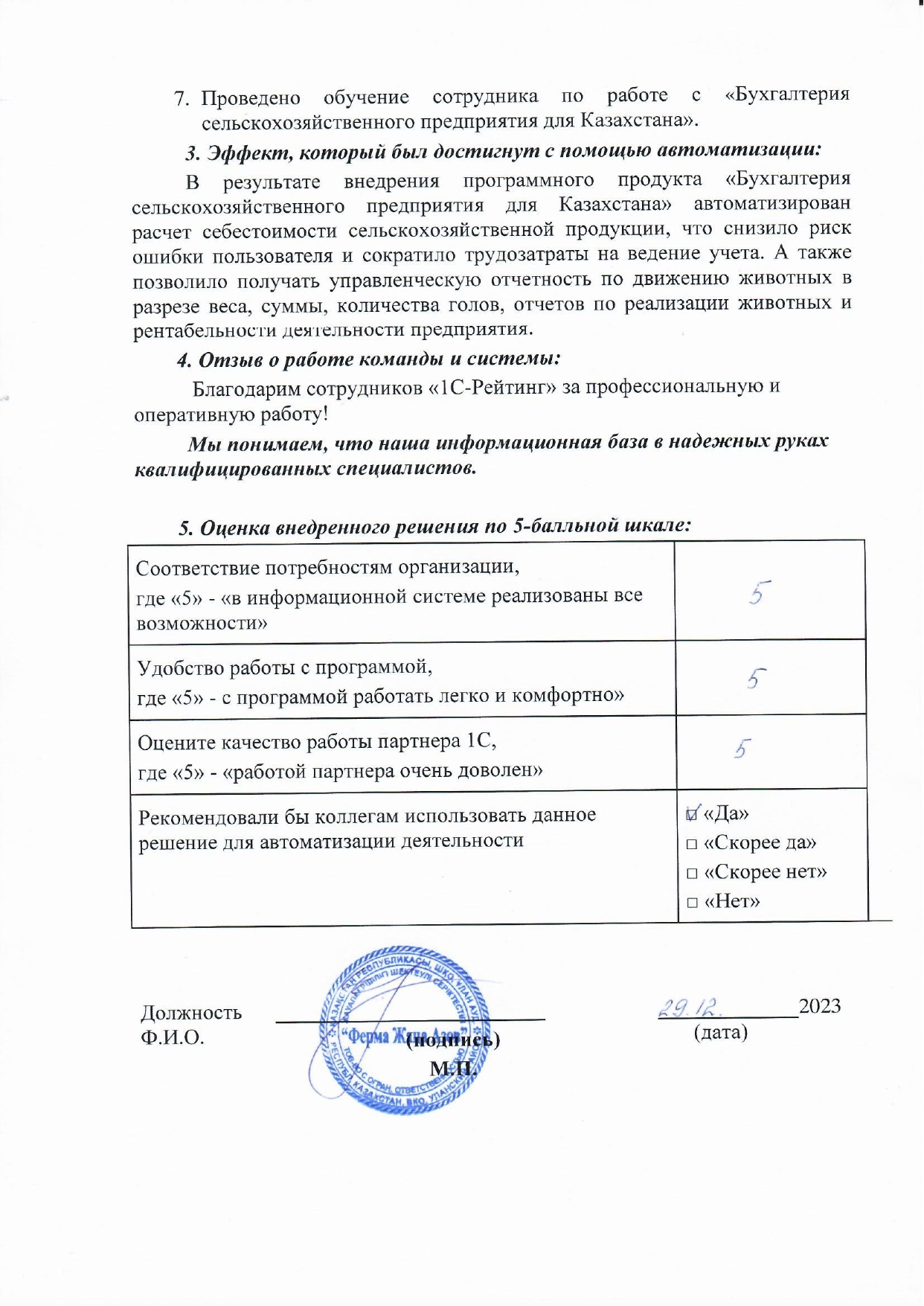 - Проведено обучение сотрудника по работе с «1С:Бухгалтерия сельскохозяйственного предприятия для Казахстана».