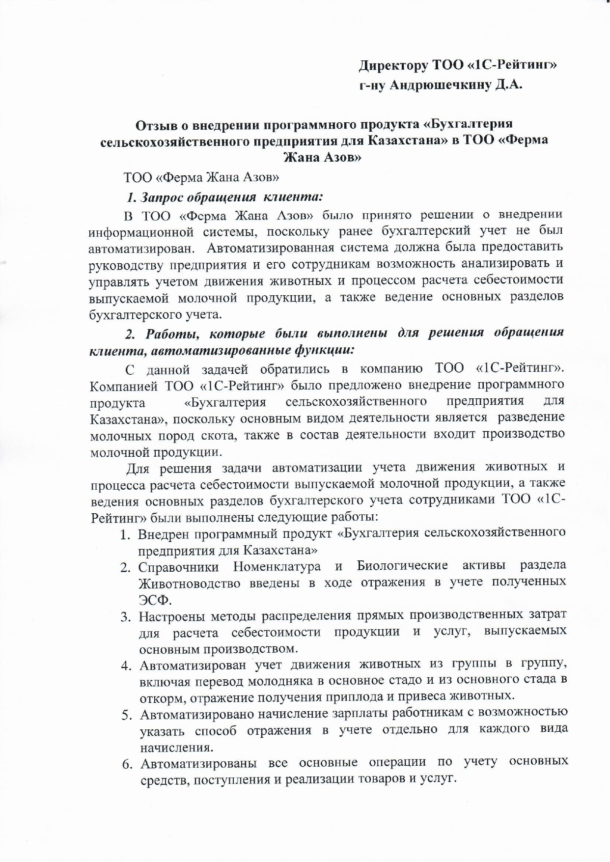 - Внедрен программный продукт «1С:Бухгалтерия сельскохозяйственного предприятия для Казахстана»