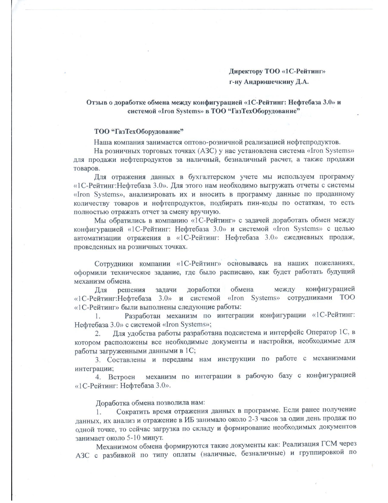 Доработка обмена между конфигурацией «1С-Рейтинг: Нефтебаза 3.0» и системой «Iron Systems» в TOO «ГазТехОборудование»