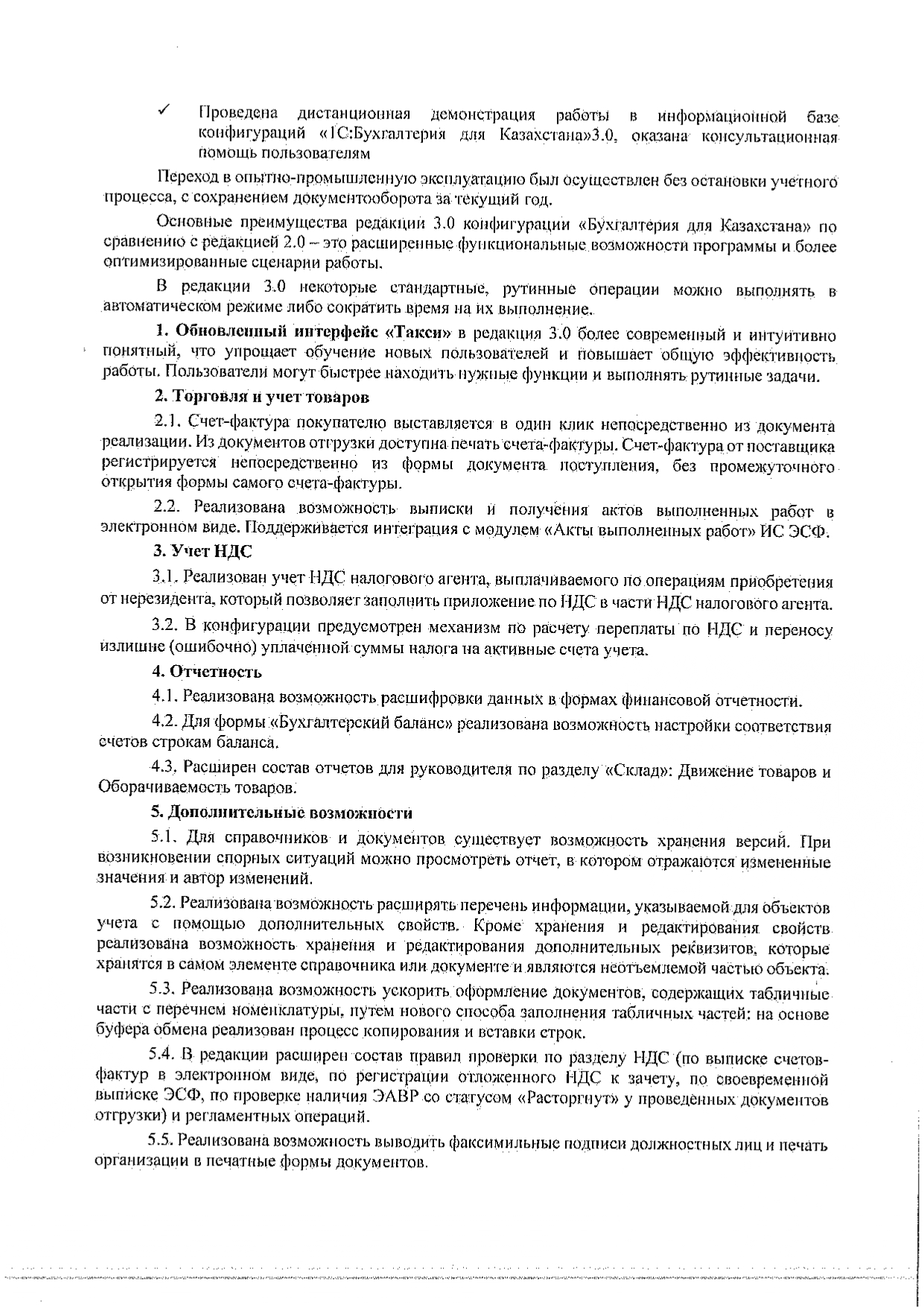 - Доработанные справочники, документы, регистры и отчеты адаптированы к новому функционалу редакции «1С:Бухгалтерия для Казахстана» 3.0