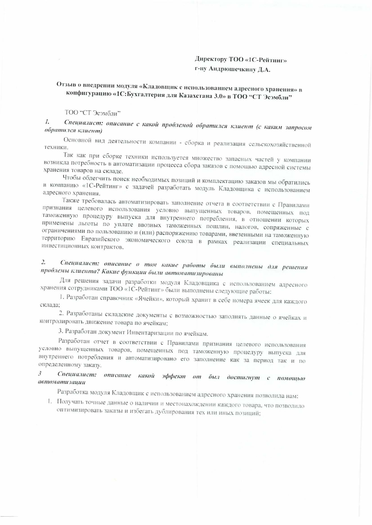 Преследуя цель облегчить поиск необходимых позиций и комплектацию заказов инициировано обращение в компанию «1С-Рейтинг» с задачей разработать модуль «Кладовщик с использованием адресного хранения».