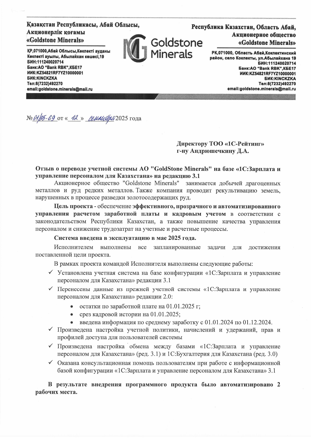 АО «GoldStone Minerals» занимается добычей драгоценных и редких металлов и проводит рекультивацию земель, нарушенных при разведке золотосодержащих руд.
