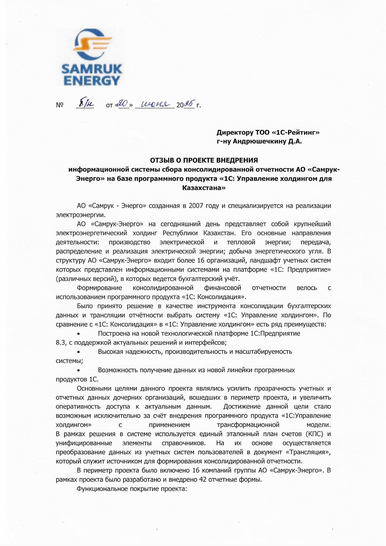 В периметр проекта было включено 16 компаний группы АО «Самрук-Энерго». В рамках проекта было разработано и внедрено 42 отчетные формы.