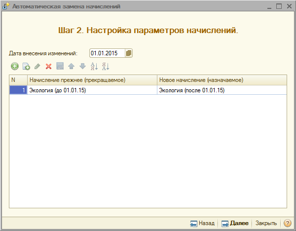 В табличной части обработки необходимо указать прекращаемые и назначаемые начисления. Обработка позволяет произвести замену сразу нескольких видов начислений. По указанным начислениям автоматически будут созданы документы для прекращения прежних начислений и назначения новых. Изменение будет произведено с даты, указанной в поле «Дата внесения изменений».