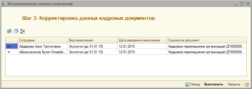 Для сотрудников, отмеченных в табличной части на шаге 3, корректируются данные непосредственно самих документов, виды расчетов заменяются на новые назначаемые начисления.