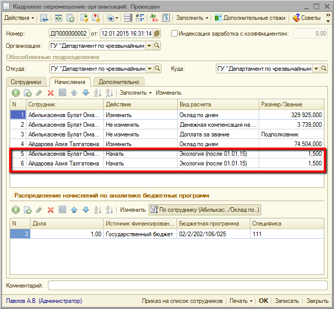 Завершает обработку нажатие кнопки «Выполнить», после которого в программе формируются документы «Кадровое перемещение организаций», прекращающие действие прежнего начисления и назначающие новое начисление. При успешном выполнении обработки выводится окно с надписью «Обработка данных завершена!».