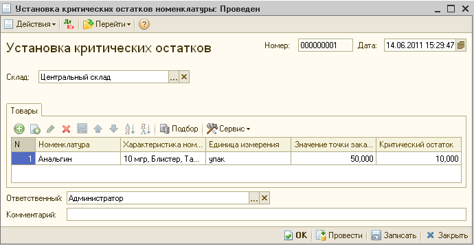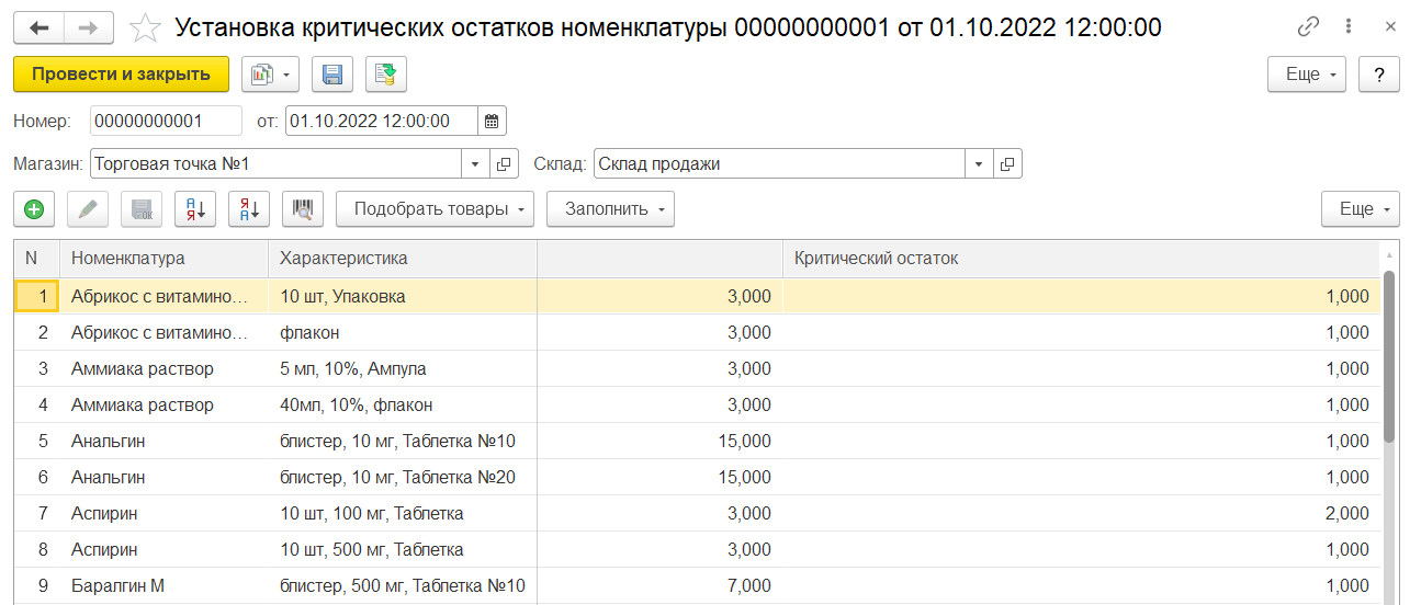 В документе указывается место хранения, для которого устанавливаются границы критических остатков лекарственных средств. В табличной части перечисляются лекарственные средства, указывается критический остаток – минимальное количество номенклатуры на складе, значение точки заказа.