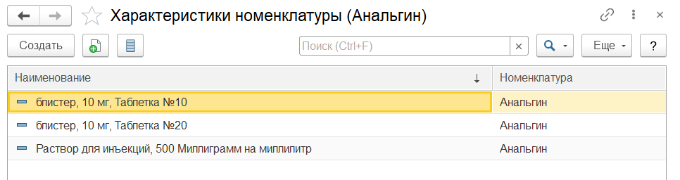 Конфигурация позволяет хранить информацию о фасовках, дозировках и формах выпуска лекарственных средств. Данная информация хранится в характеристике лекарственного средства. Для каждого лекарственного средства может быть создано любое количество характеристик. Использование характеристик позволяет анализировать остатки, а также определять себестоимость лекарственных средств в разрезе характеристик, т.е. фасовок, дозировок и форм выпуска.