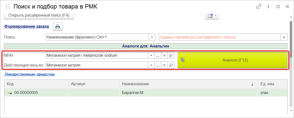 • кнопка «Поиск» - чтобы подобрать аналог для лекарственного средства нужно установить курсор на номенклатуре, для которой подбирается аналог, нажать кнопку «Аналоги» и система выдаст список подходящих лекарственных средств.