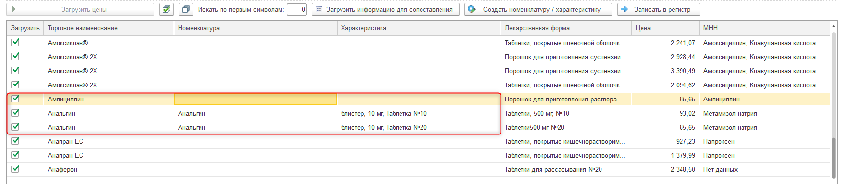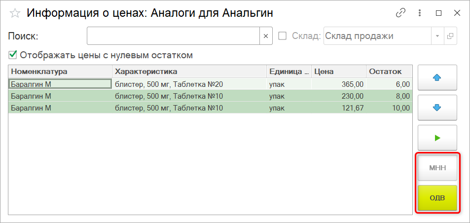 • кнопка «Цены» - для подбор аналога необходимо выбрать номенклатуру и нажать на кнопку подбора аналога ОДВ или МНН.