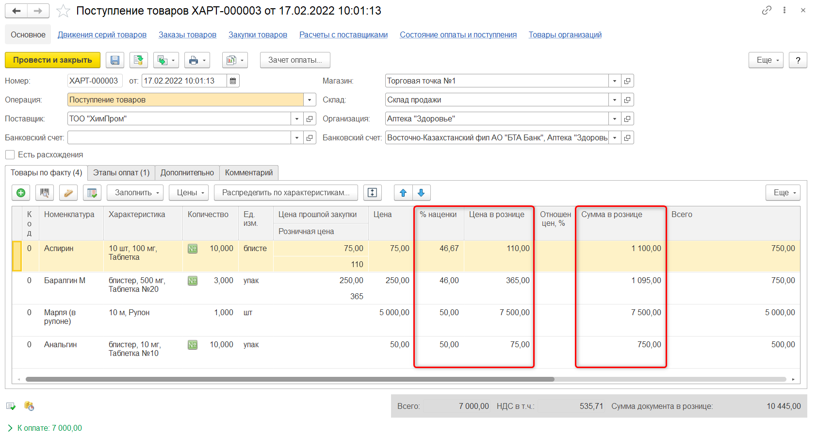 Автоматическая наценка для формирования розничной цены лекарственных средств в решении «1С:Аптека для Казахстана»