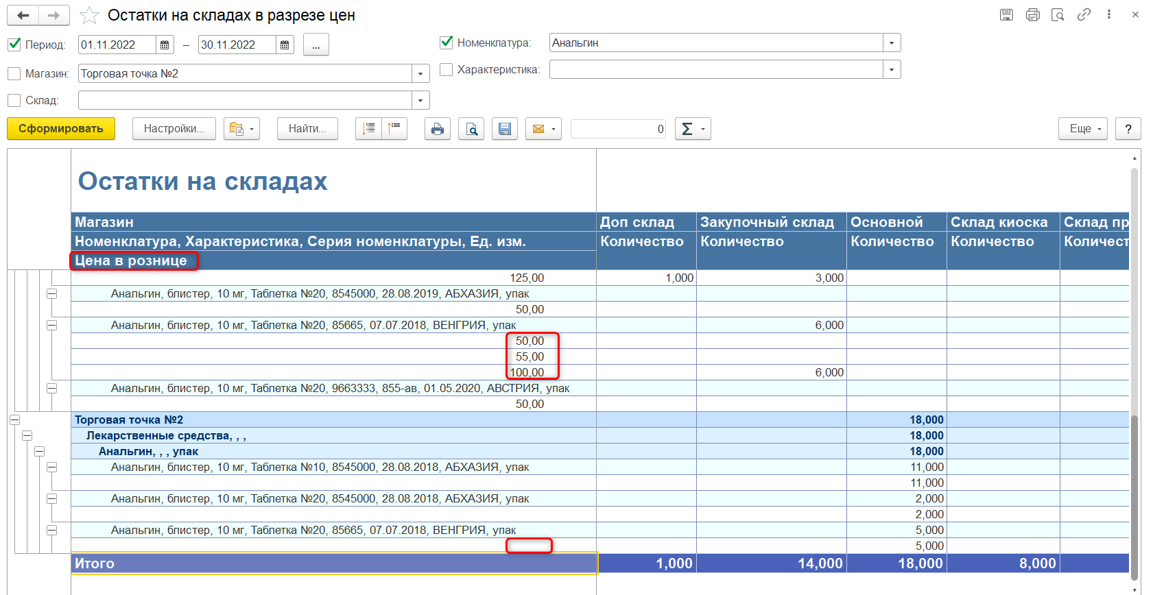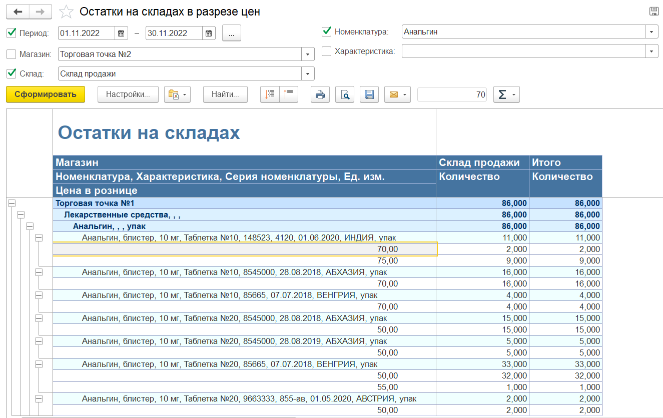 В отчет выводится информация о лекарственных средствах, сериях номенклатуры, ценах, количестве остатков на складах.