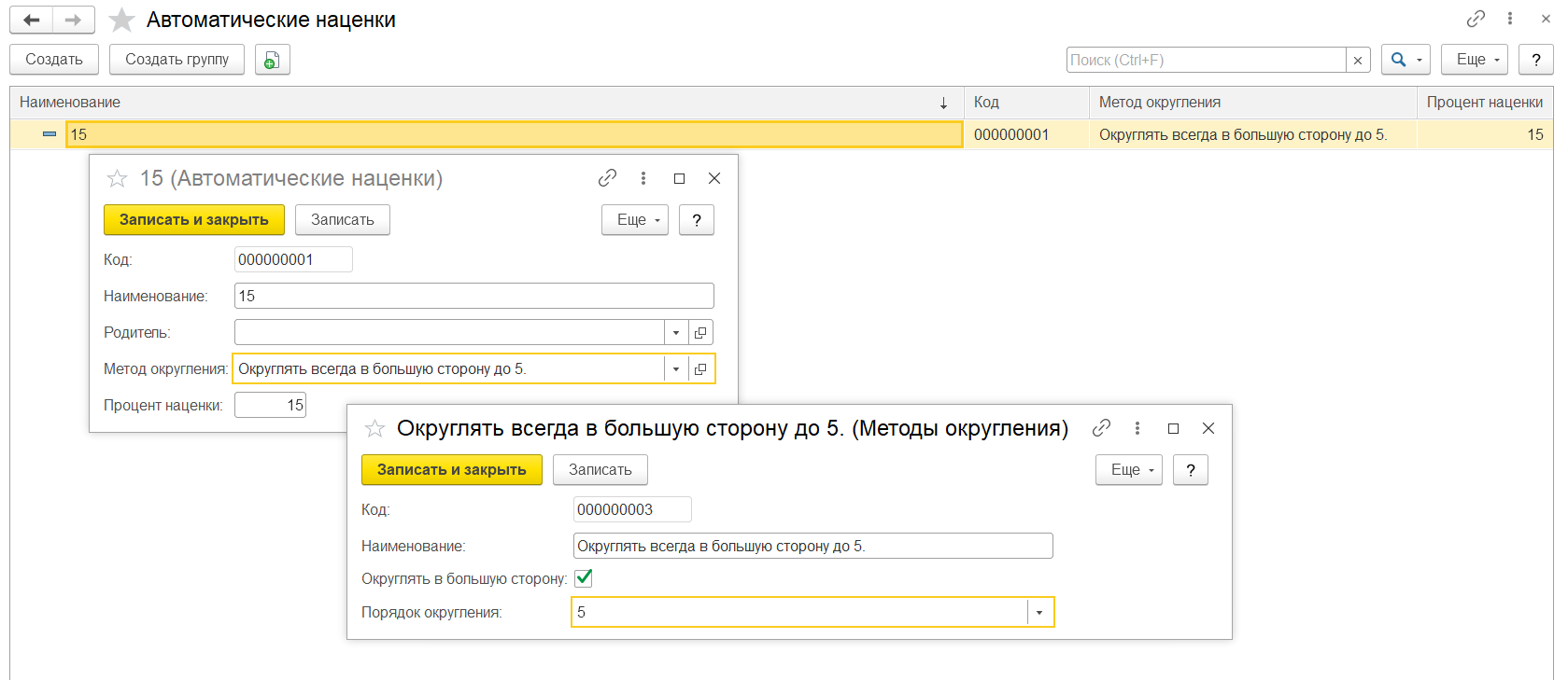 В конфигурации предусмотрена возможность хранения параметров автоматических наценок, таких, как процент наценки и метод округления, которые используются для автоматического расчета розничной цены. Процент наценки можно установить как для отдельной номенклатурной единицы, так и для группы номенклатур в целом.