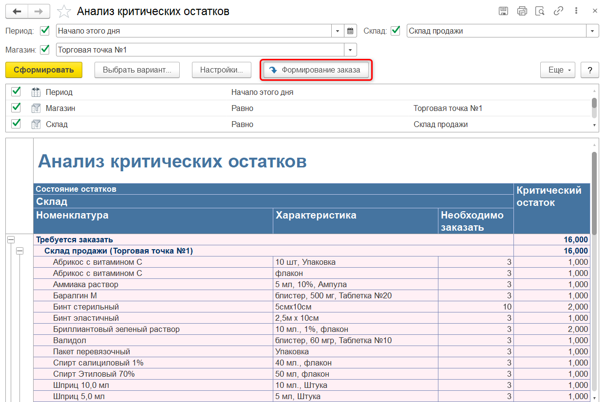 Из отчета «Анализ критических остатков» может быть запущен механизм формирования документов «Заказ поставщику». Для этого на форме отчета предусмотрена кнопка «Формирование заказа».