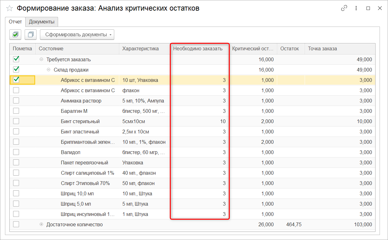 Пользователю необходимо отметить те позиции, которые он хочет заказать. Количество номенклатуры указывается в колонке «Необходимо заказать».