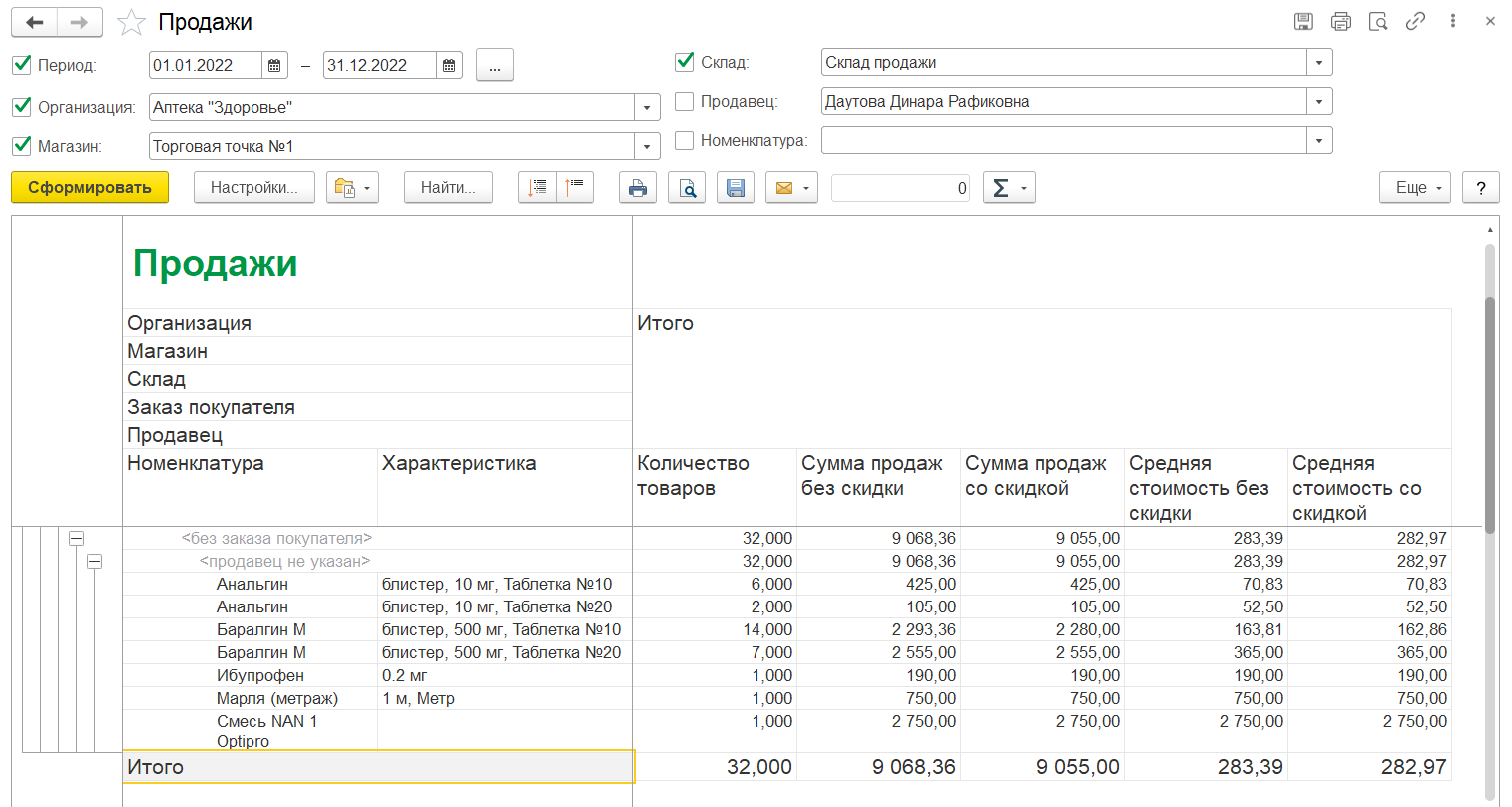 В отчет выводится информация о количестве проданных товаров со скидкой, без скидки, средней стоимости проданных товаров и т.д.