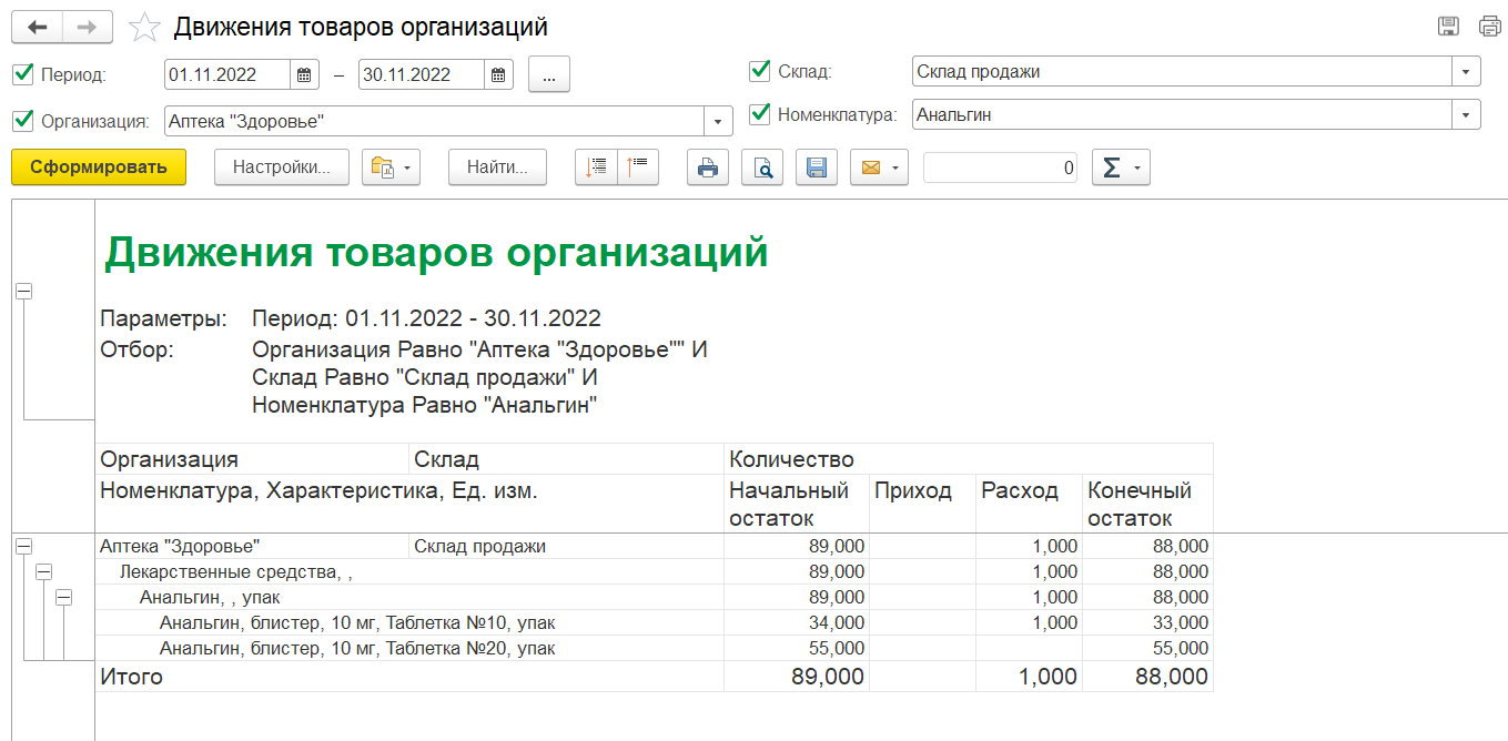 В отчет выводится информация о лекарственных средствах, сроках годности, количестве и сумме начального остатка, прихода, расхода и конечного остатка.