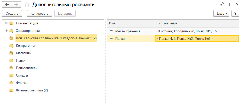 Каждый элемент справочника «Номенклатура» имеет список дополнительных реквизитов: торговое наименование, международное непатентованное наименование, фармакологическая группа, основное действующее вещество, содержит психотропные вещества, содержит прекурсоры, отпуск по рецепту, содержит наркотические вещества.