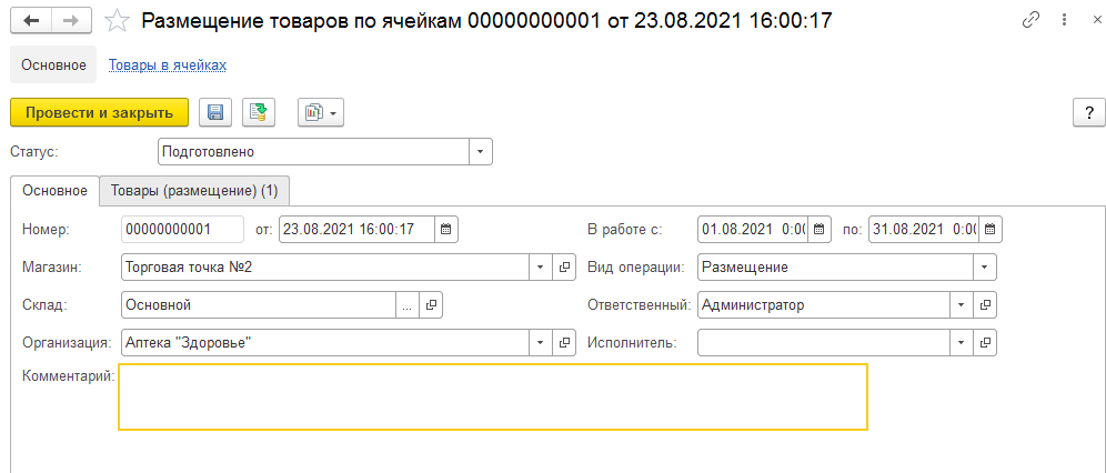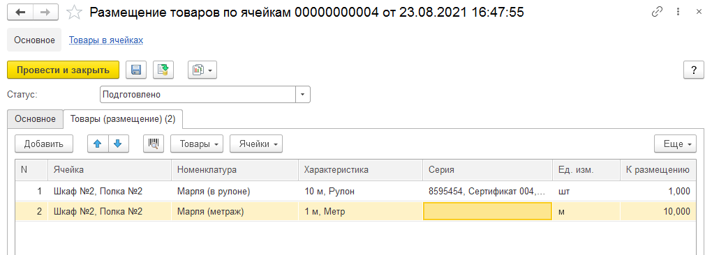 При разукомплектации в режиме РМК товара, разнесенного в ячейку, происходит списание одной единицы комплекта с ячейки, где он был размещен, и оприходование в эту ячейку комплектующих. При этом автоматически создается документ «Размещение товаров по ячейкам» с видом операции «Перемещение». В табличной части документа отобразятся сведения как по комплекту, так и по комплектующим.