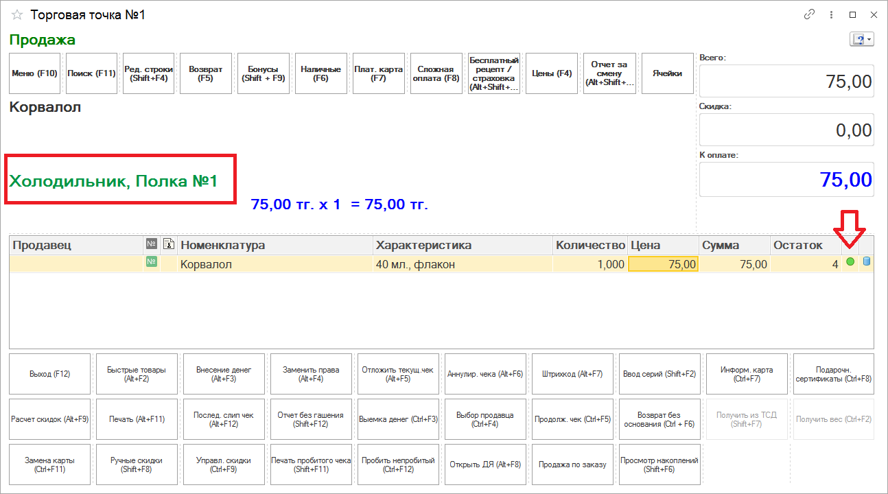 При выборе товара, всё количество которого было разнесено в одну ячейку, автоматически считается, что при продаже данный товар будет списан с данной ячейки. Описание ячейки отображается в левой части формы над списком товаров. Просмотреть информацию по распределению товара в ячейке можно нажав соответствующую пиктограмму. Если она окрашена в зеленый цвет, это значит, что для товара указана ячейка, с которой будет производиться списание, и количество товара, списываемого с ячейки, соответствует количеству, указанному в табличной части в колонке «Количество».