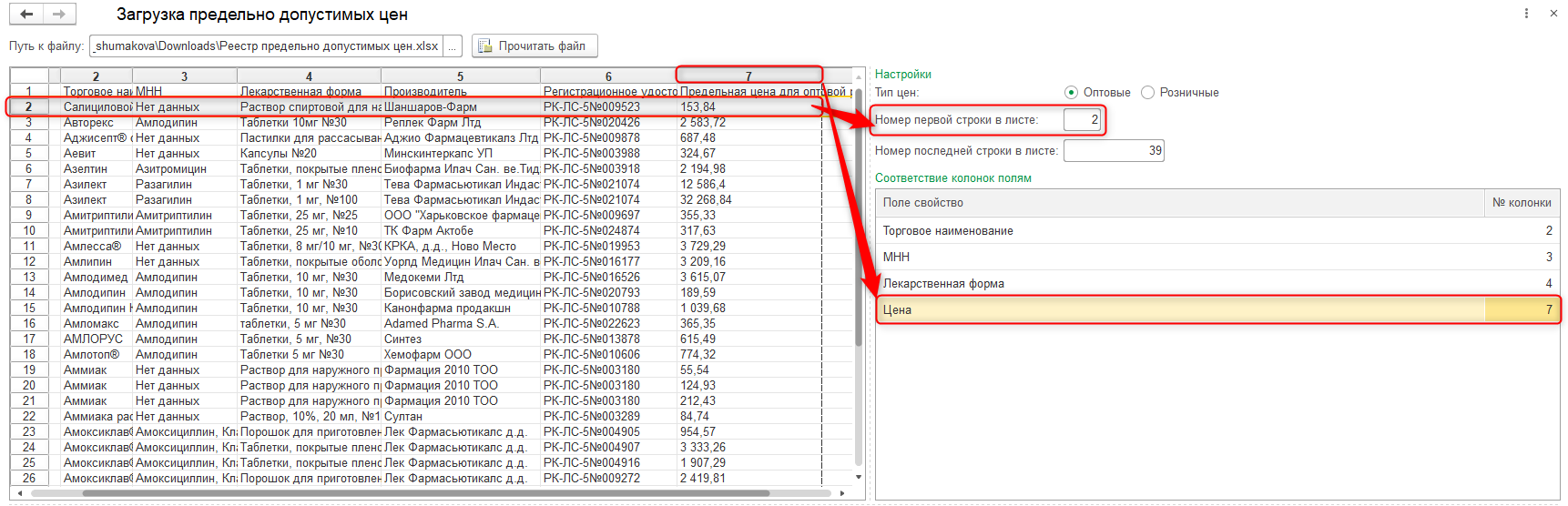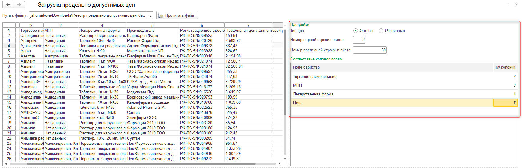 В окне «Соответствие колонок полям» устанавливаются номера колонок с наименованием, МНН, лекарственной формой и ценой.
