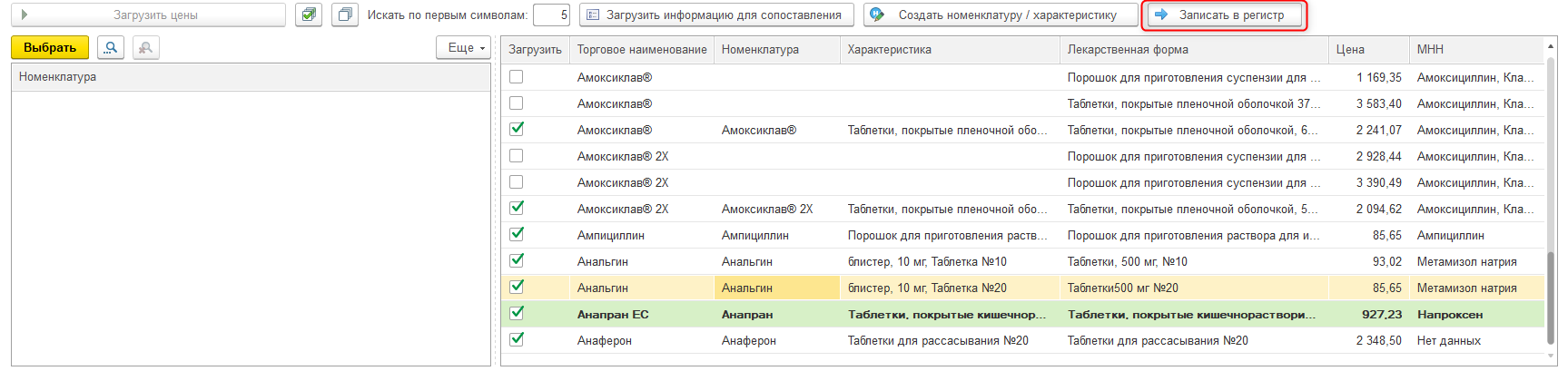 После выбора списка элементов, необходимых для загрузки в конфигурацию, сопоставления торгового наименования и номенклатуры, заполнения сведений о качественных характеристиках необходимо записать сведения в регистр по кнопке «Записать в регистр».