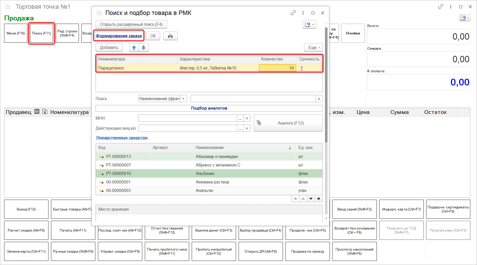 Также добавить товар в заявку можно на форме подбора товаров по кнопке Поиск. На форме поиска следует нажать на ссылку Формирование заказа. При этом будет доступна табличная часть «Формирование заказа».
