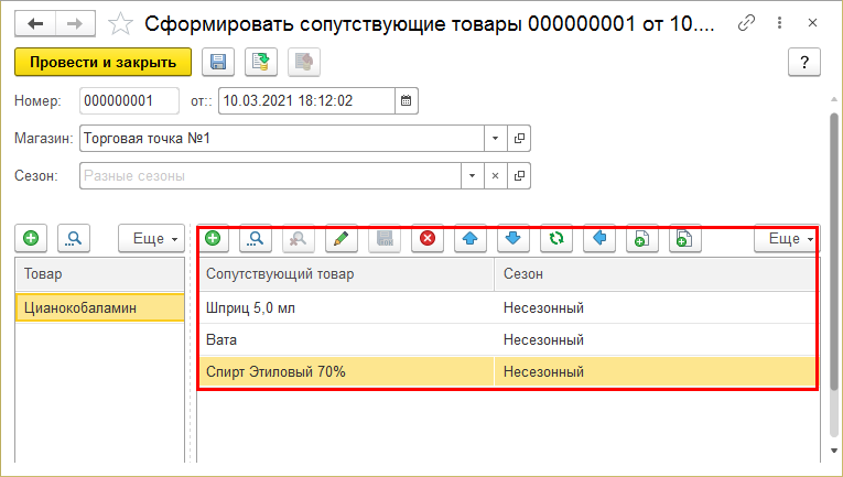 Документ разделен на две табличные части. В левой части заполняется основной товар из справочника «Номенклатура», в правой – сопутствующие для него товары. Например, при покупке лекарственного средства «Цианокобаламин» (в ампулах), продавец может предложить шприцы, вату и спирт. У одного товара может быть несколько сопутствующих товаров, и при этом они могут быть сопутствующими как круглогодично, так и посезонно.
