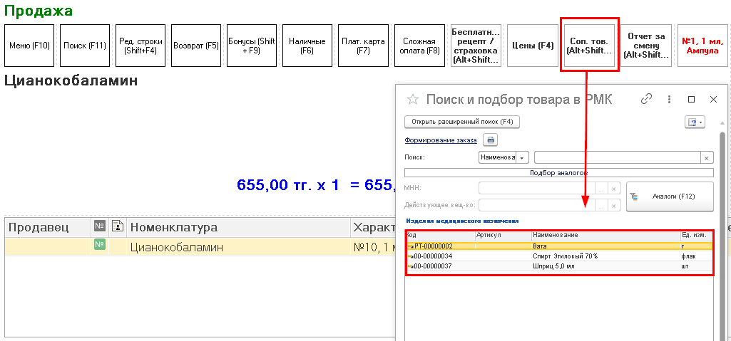 В РМК при выборе в форме заказа товара «Цианокобаламин» необходимо нажать кнопку «Соп. тов.» в командной панели заказа. При этом в форме выбора откроется список сопутствующих товаров, из которого они могут быть добавлены в заказ покупателя.