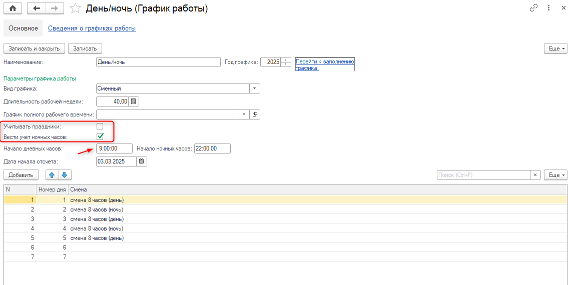 указание рабочих смен на каждый день цикла и даты начала отсчета (дата, с которой начинается цикл графика).