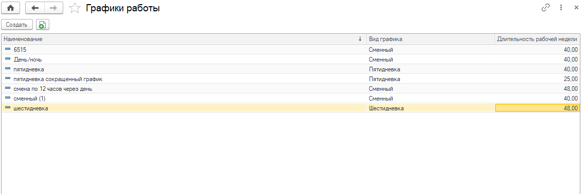 При первом запуске по умолчанию доступно два графика работы: пятидневка и шестидневка.