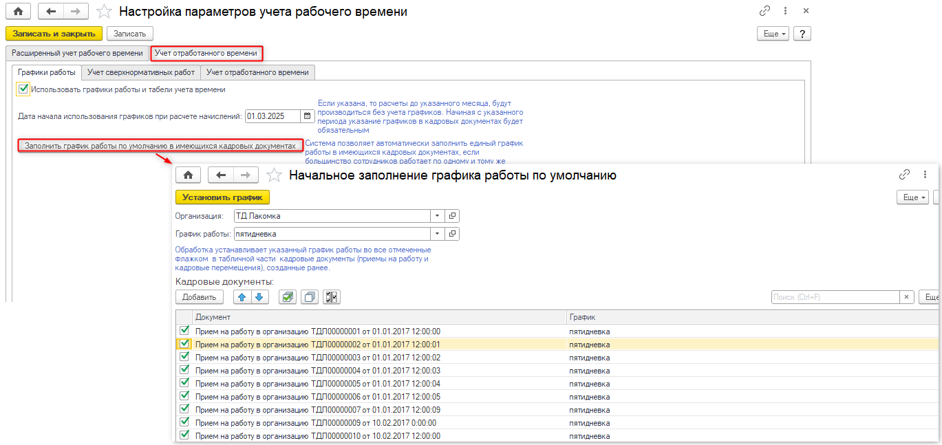 При первом запуске у сотрудников имеющиеся кадровые документы будут заполнены по умолчанию графиком – пятидневка.
