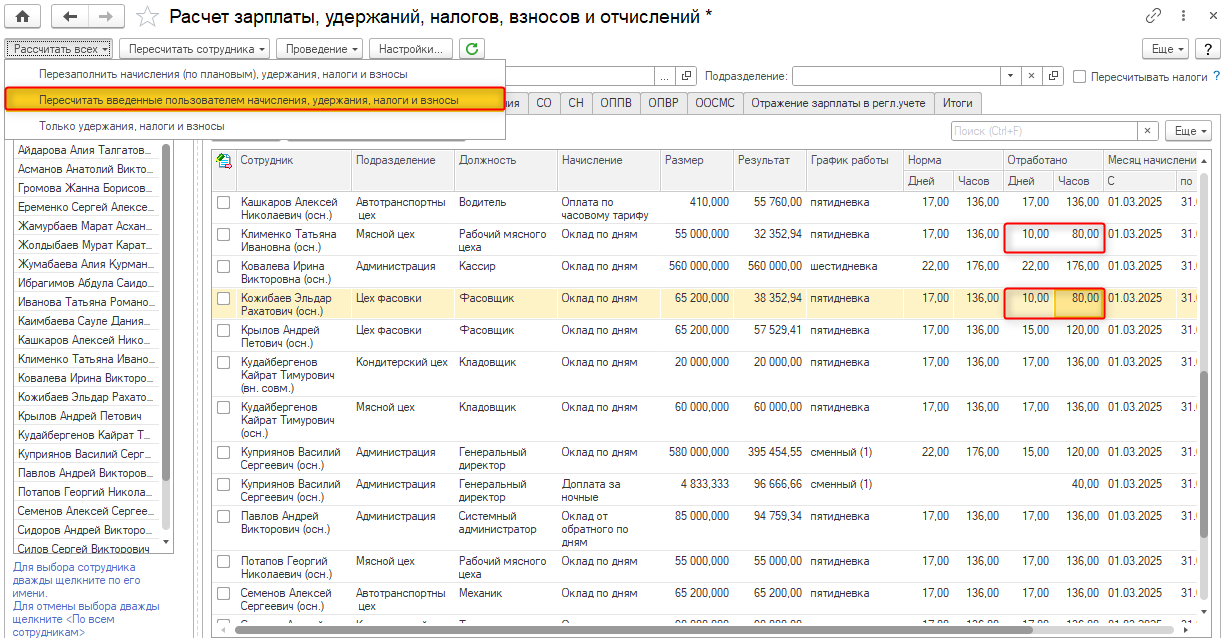 Кроме этого, для пересчета сумм только по одному сотруднику, можно воспользоваться командами по кнопке
