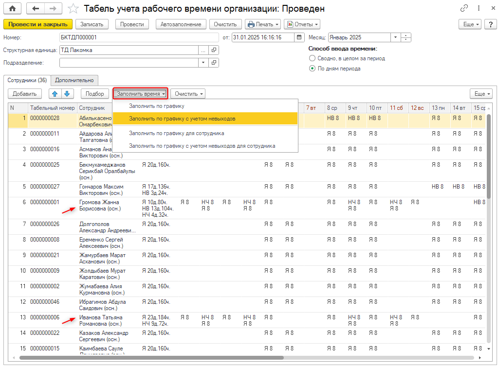 — заполнить по графику для всех или для текущего сотрудника с учетом невыходов. Явка и ночные часы заполняются
